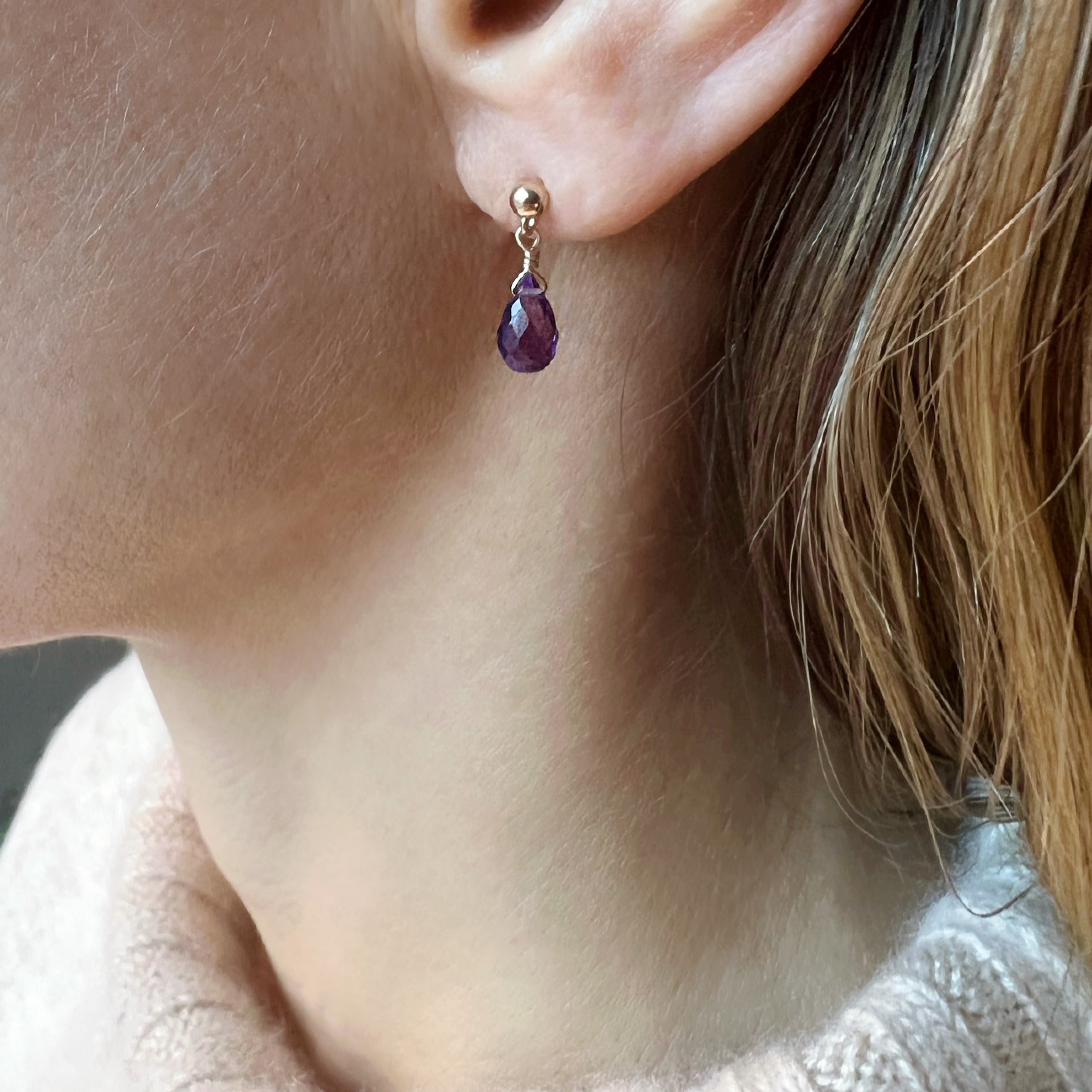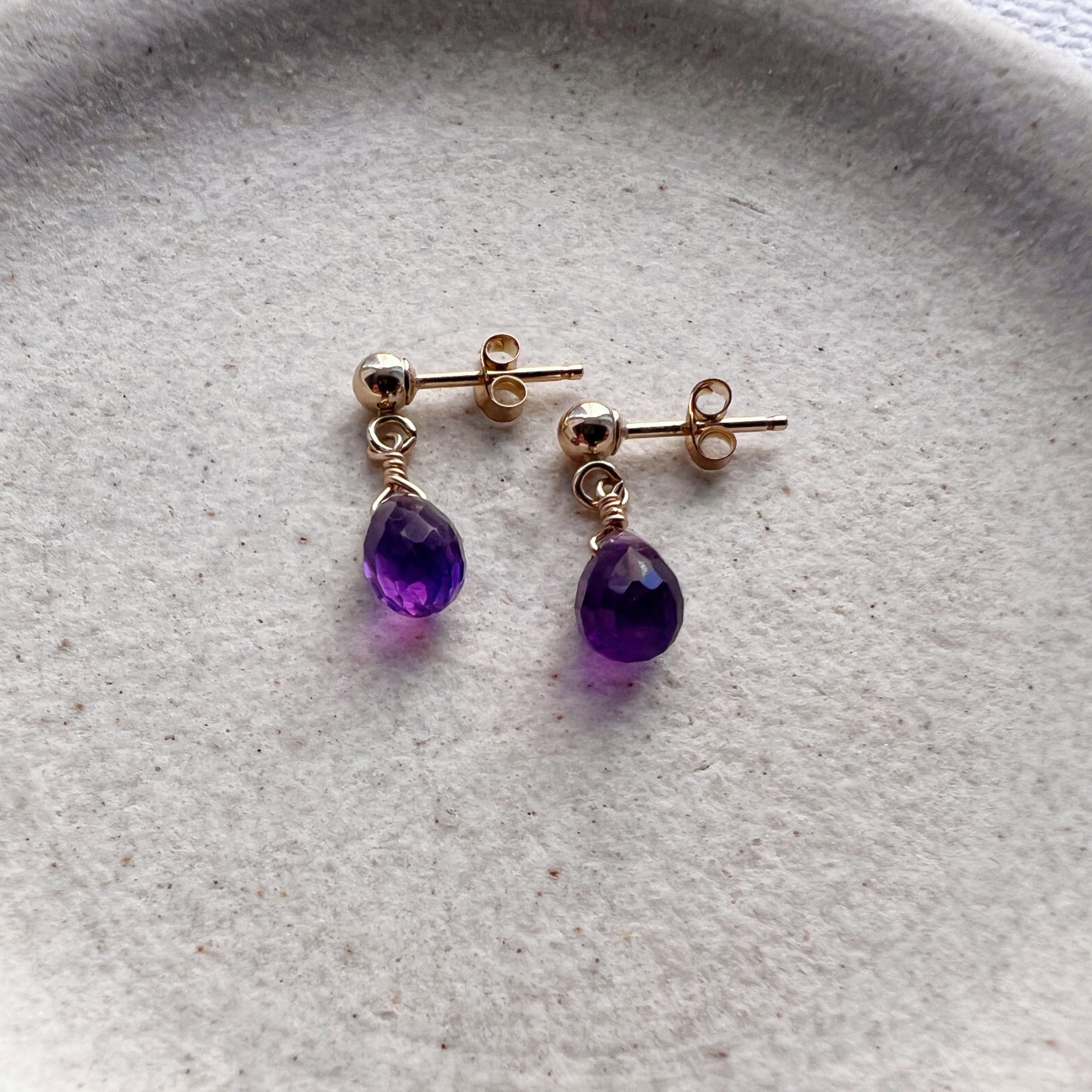 Our dainty amethyst gemstone stud earrings are lightweight and minimalist. The perfect everyday earrings for a simple delicate look. They feature genuine faceted teardrop amethyst gemstones that dangle from dainty spherical studs. Amethyst is the February birthstone.
