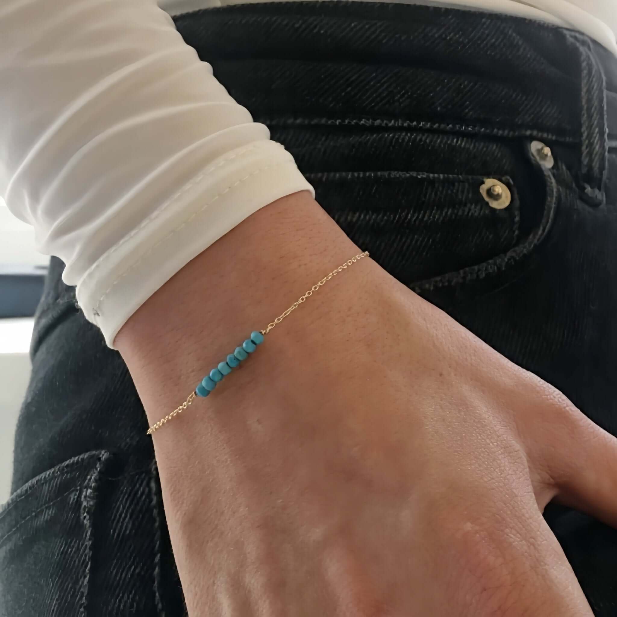 This minimalist December birthstone bracelet features tiny genuine turquoise beads hand-strung on a delicate, durable chain. Turquoise is known for its vibrant blue-green color and symbolism of protection and calm energy. A thoughtful December birthday gift and a beautiful addition to any dainty bracelet stack.