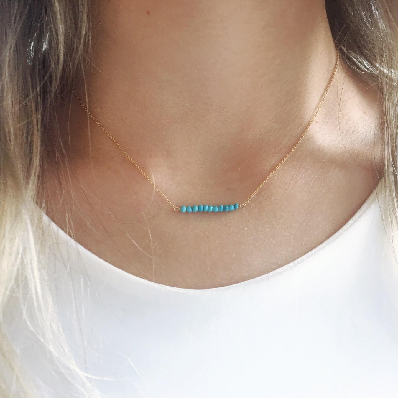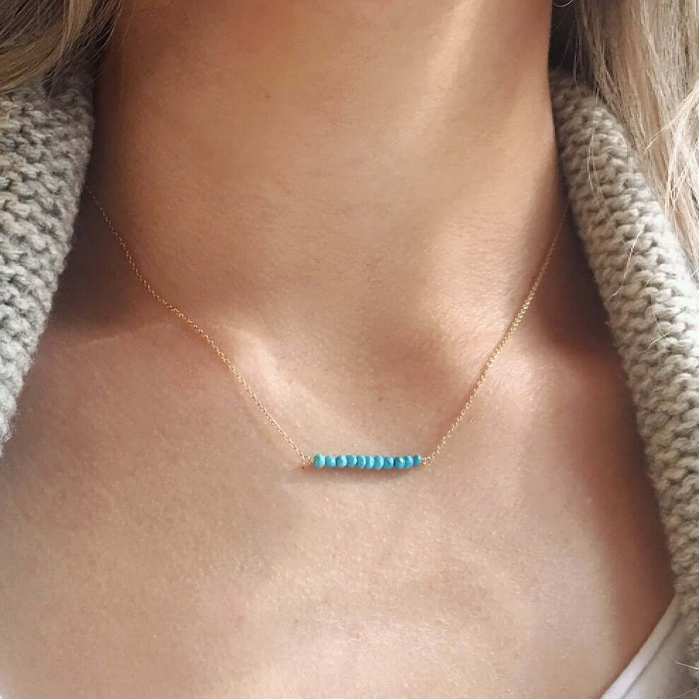 A dainty turquoise beaded necklace made with genuine turquoise — the traditional December birthstone symbolizing protection, wisdom, and good fortune. Its minimalist bar design adds the perfect pop of color for everyday wear. A meaningful December birthday gift or a versatile gemstone piece for any jewelry lover.