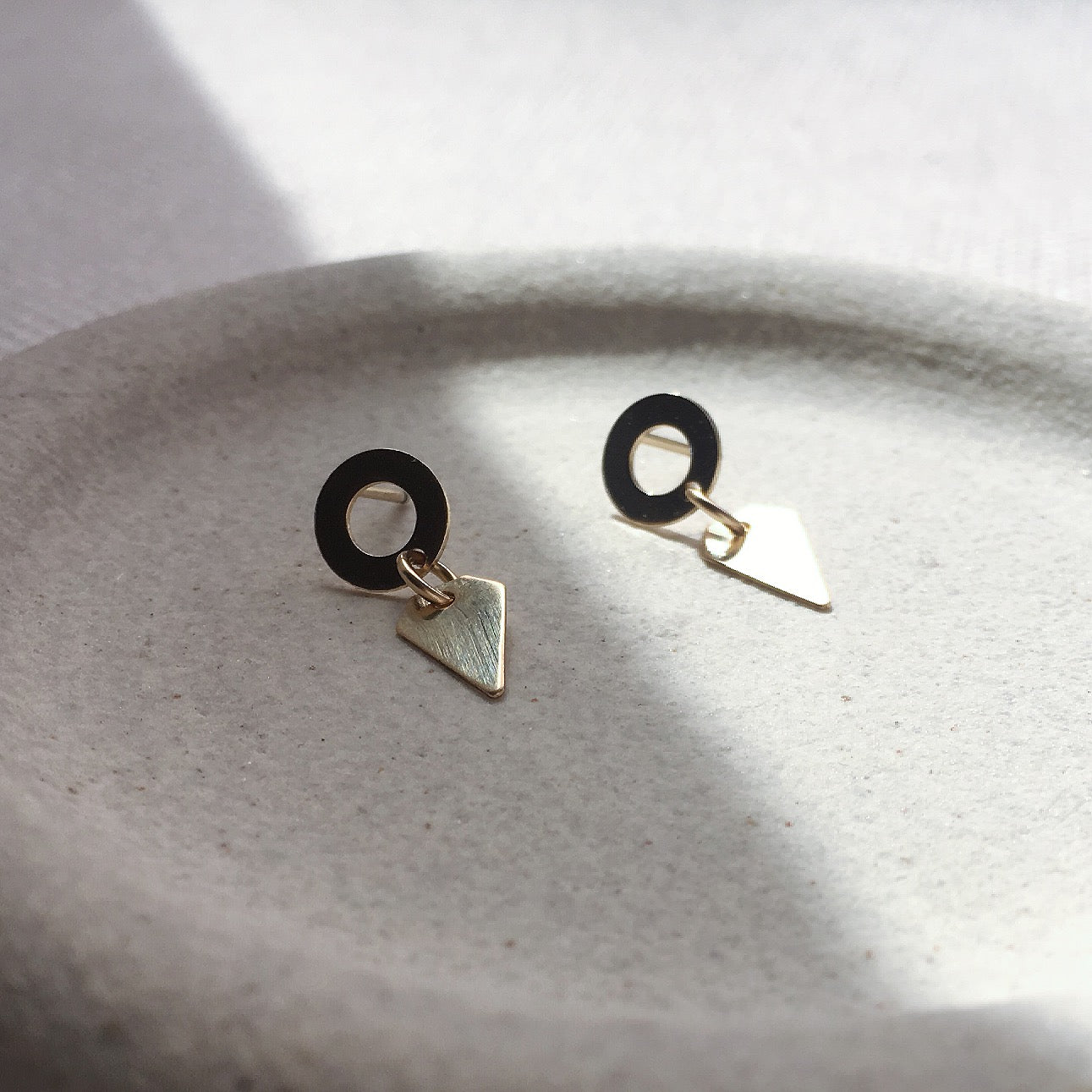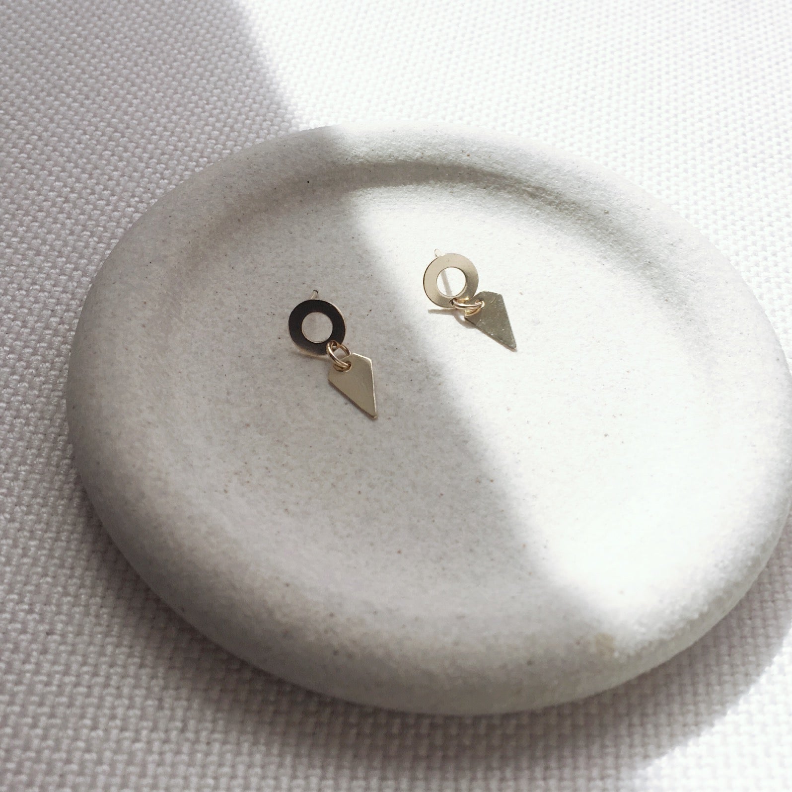 These dainty gold earrings are handcrafted featuring an open circular stud that carries a dangling golden spike. These lightweight stud earrings are effortless and great for everyday wear.
