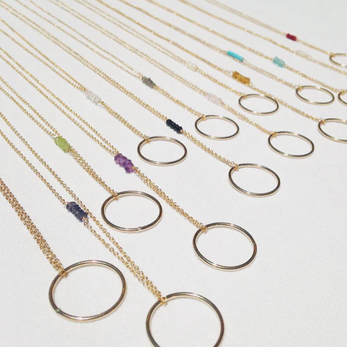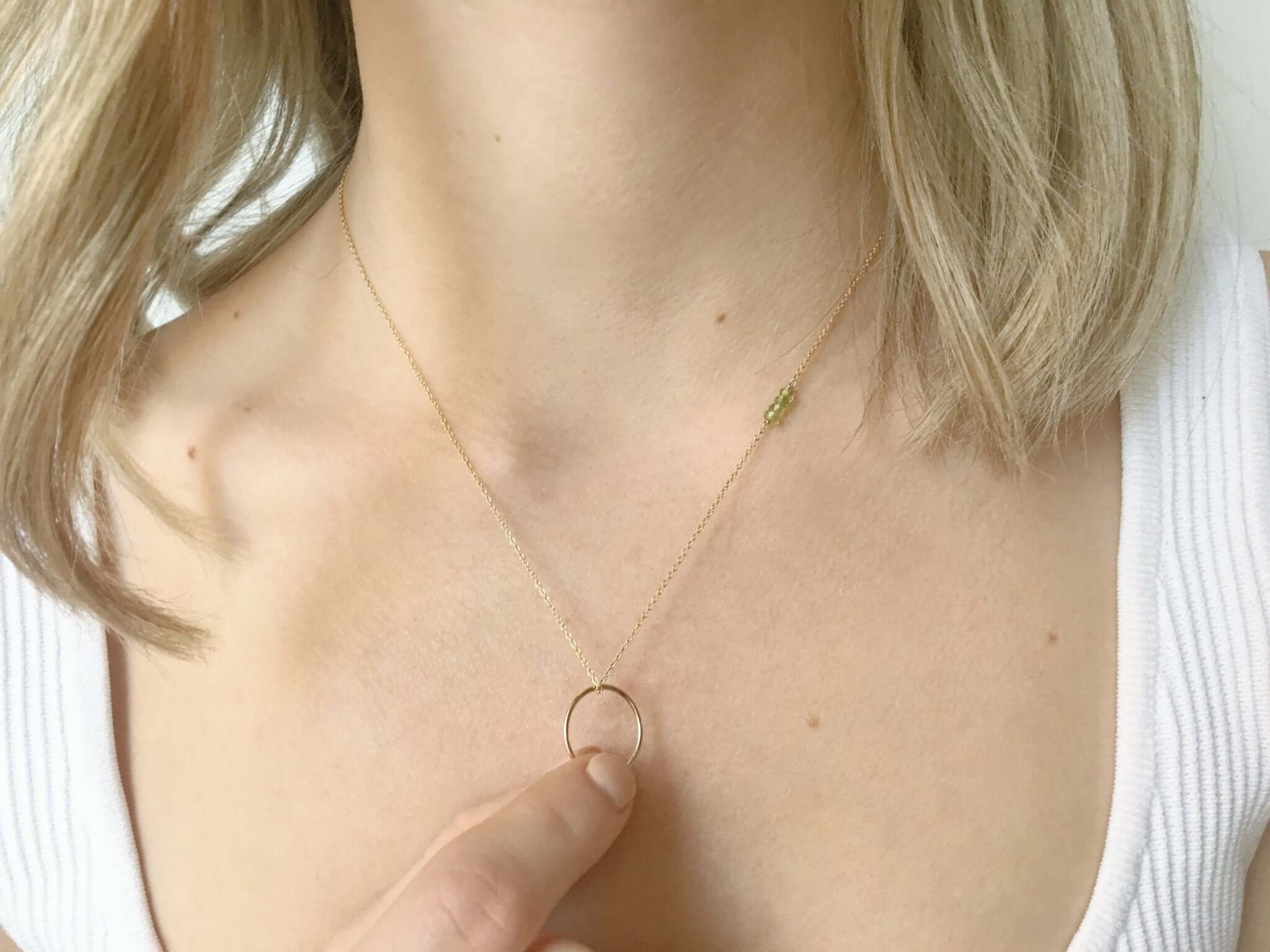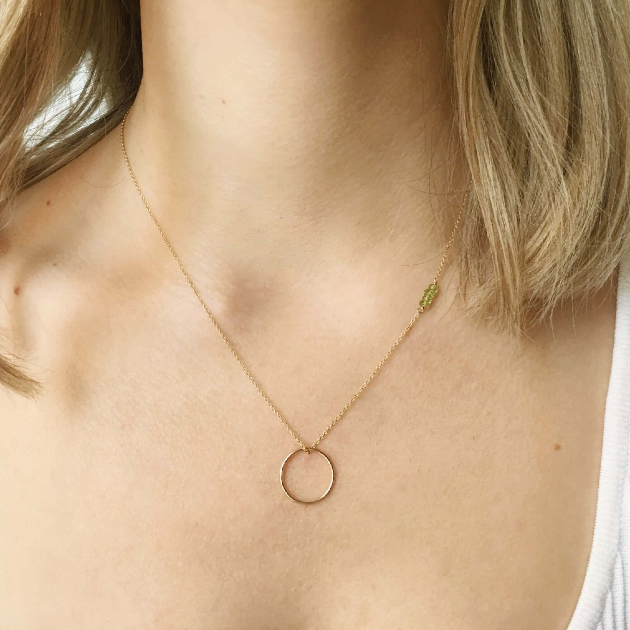 This peridot circle necklace features a delicate open circle pendant accented with a genuine peridot gemstone. Designed with a minimalist silhouette, this necklace offers a subtle pop of green that feels timeless, effortless, and easy to wear every day.