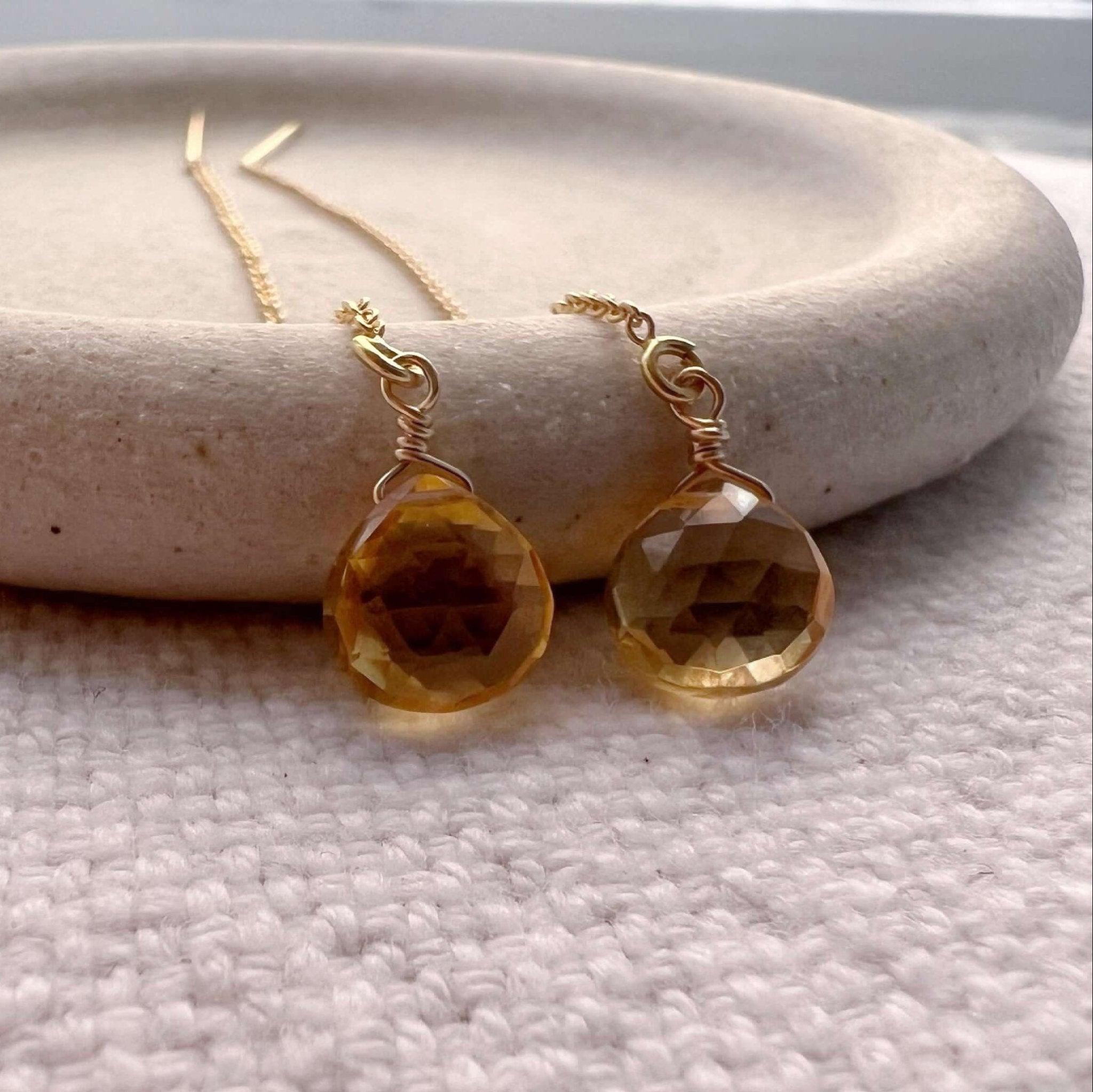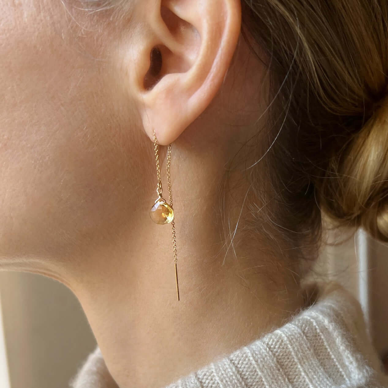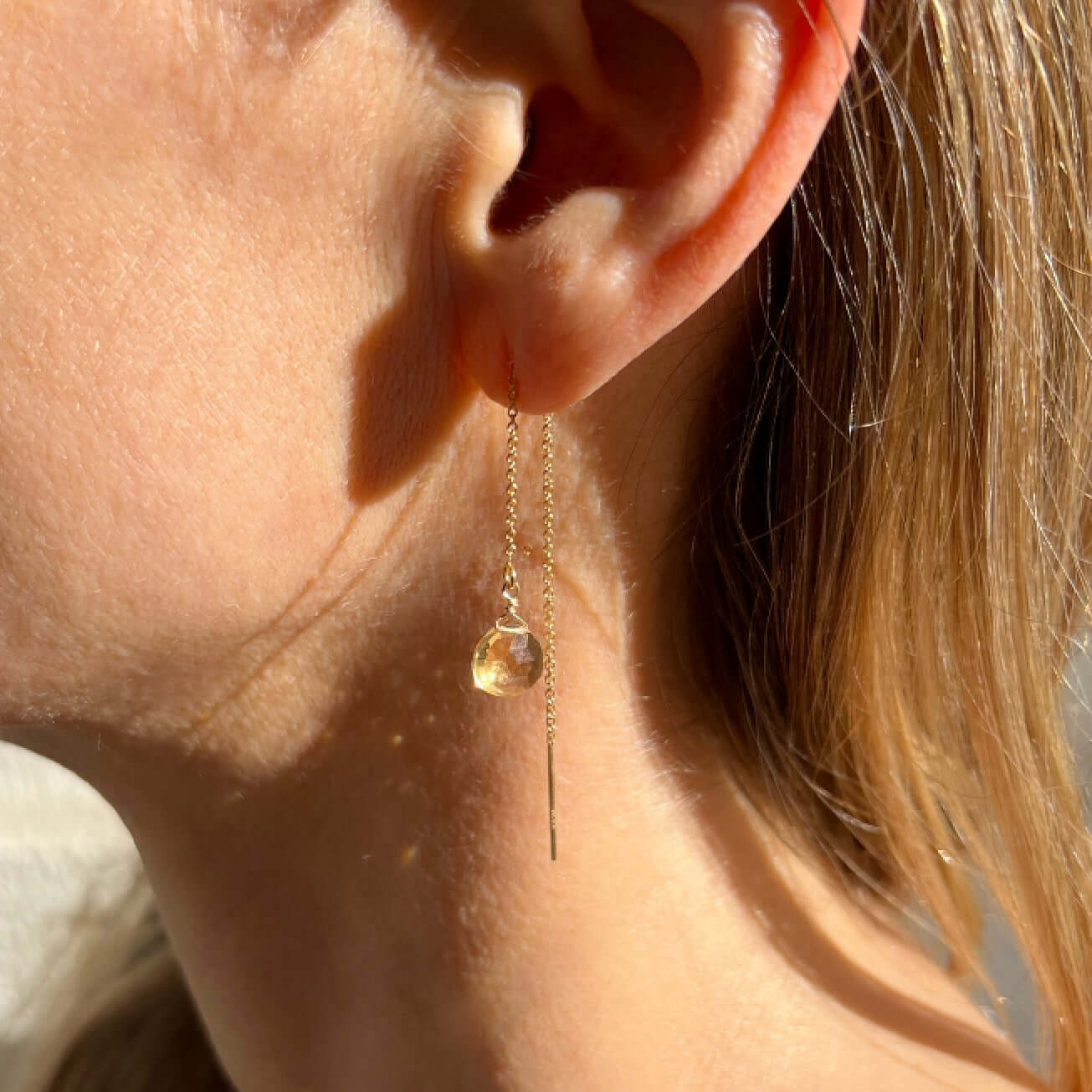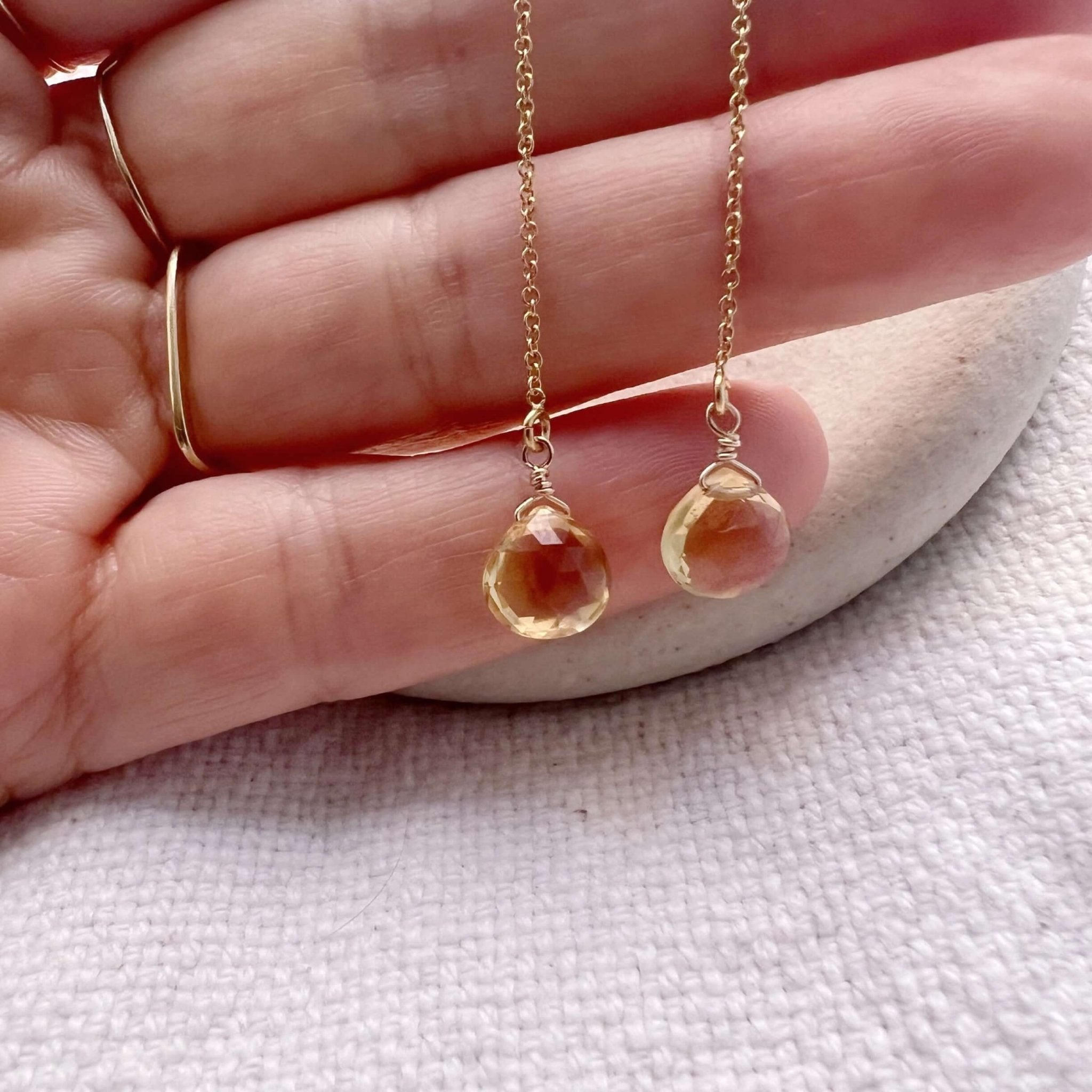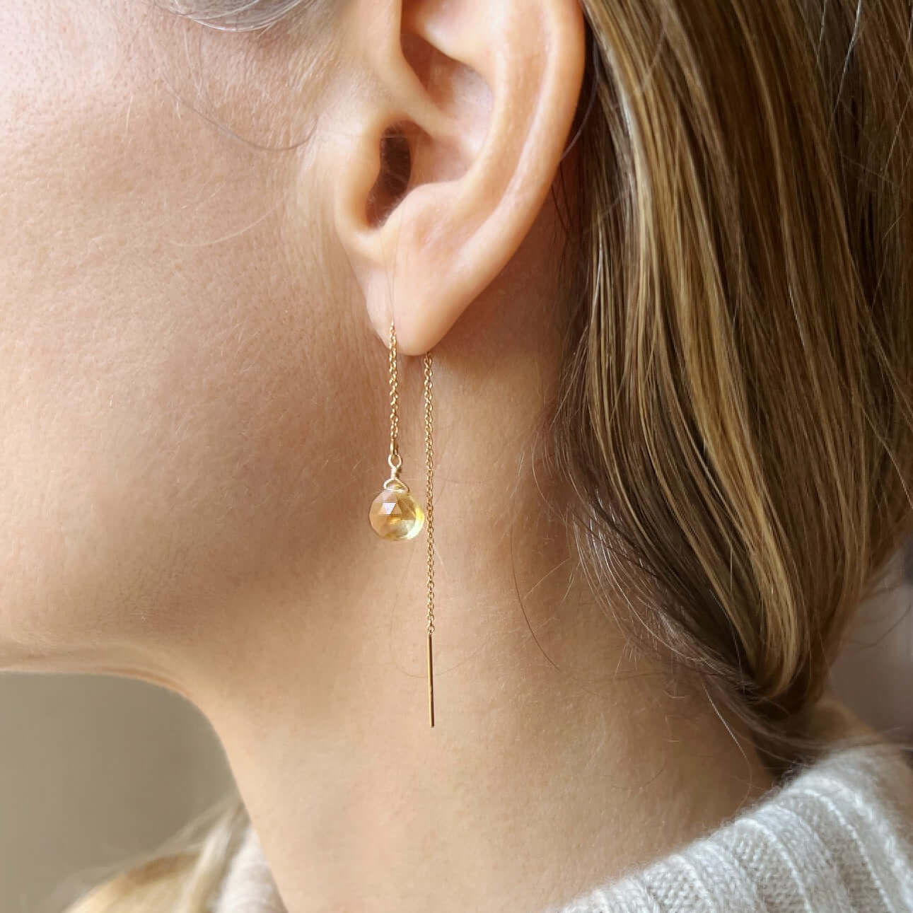 Our dainty citrine dangle earrings are the perfect lightweight accessory for everyday wear. Despite their simplicity, the sparkling semi-precious citrine that hangs from a sleek cable chain threader makes a bold statement. This citrine earring is the November birthstone and makes the perfect birthday gift.