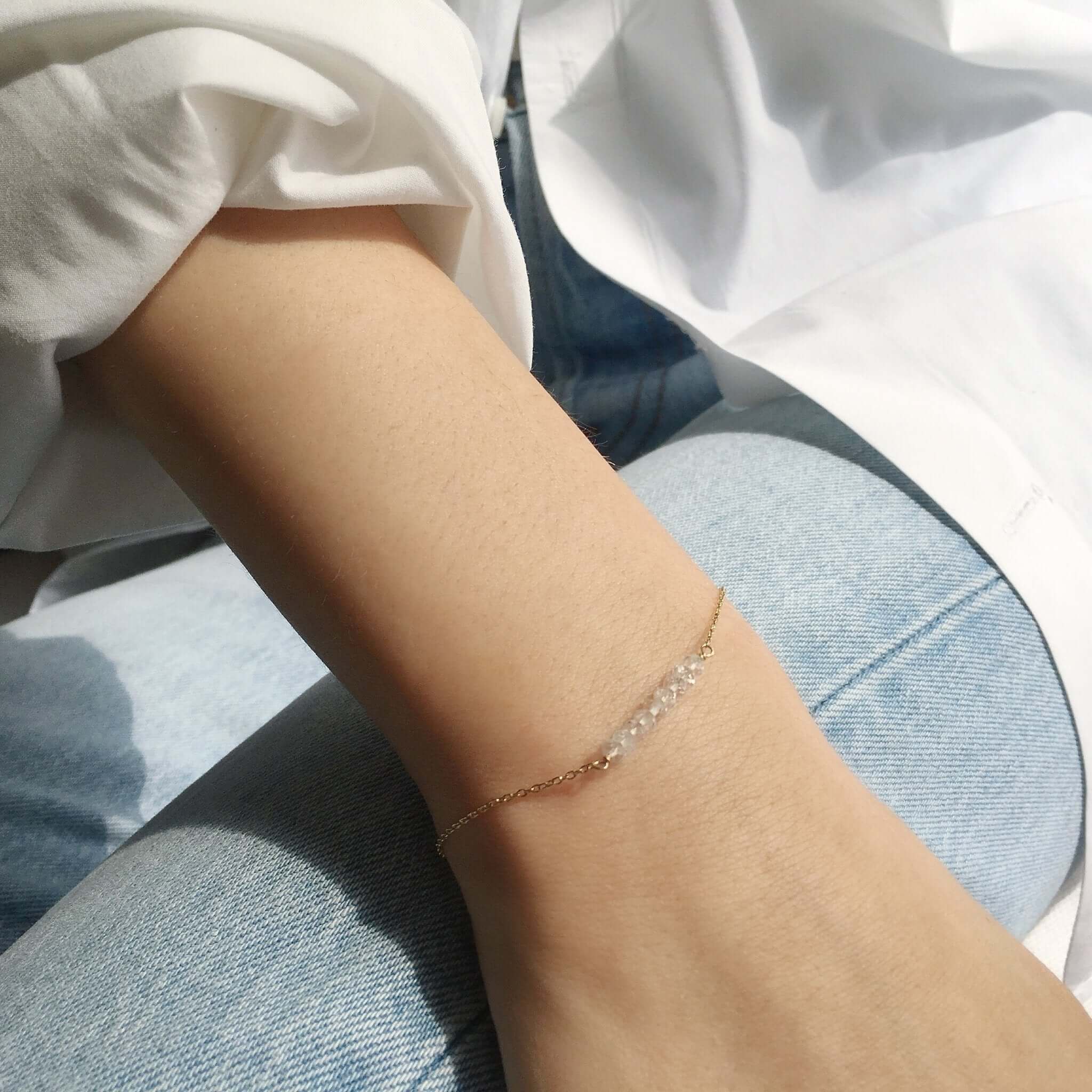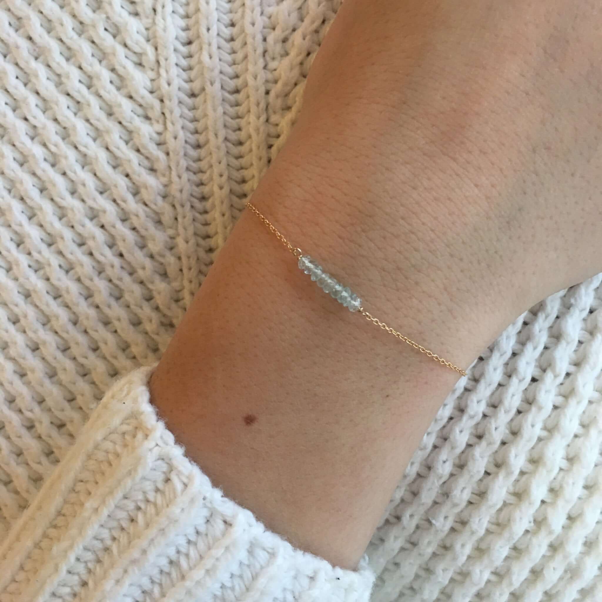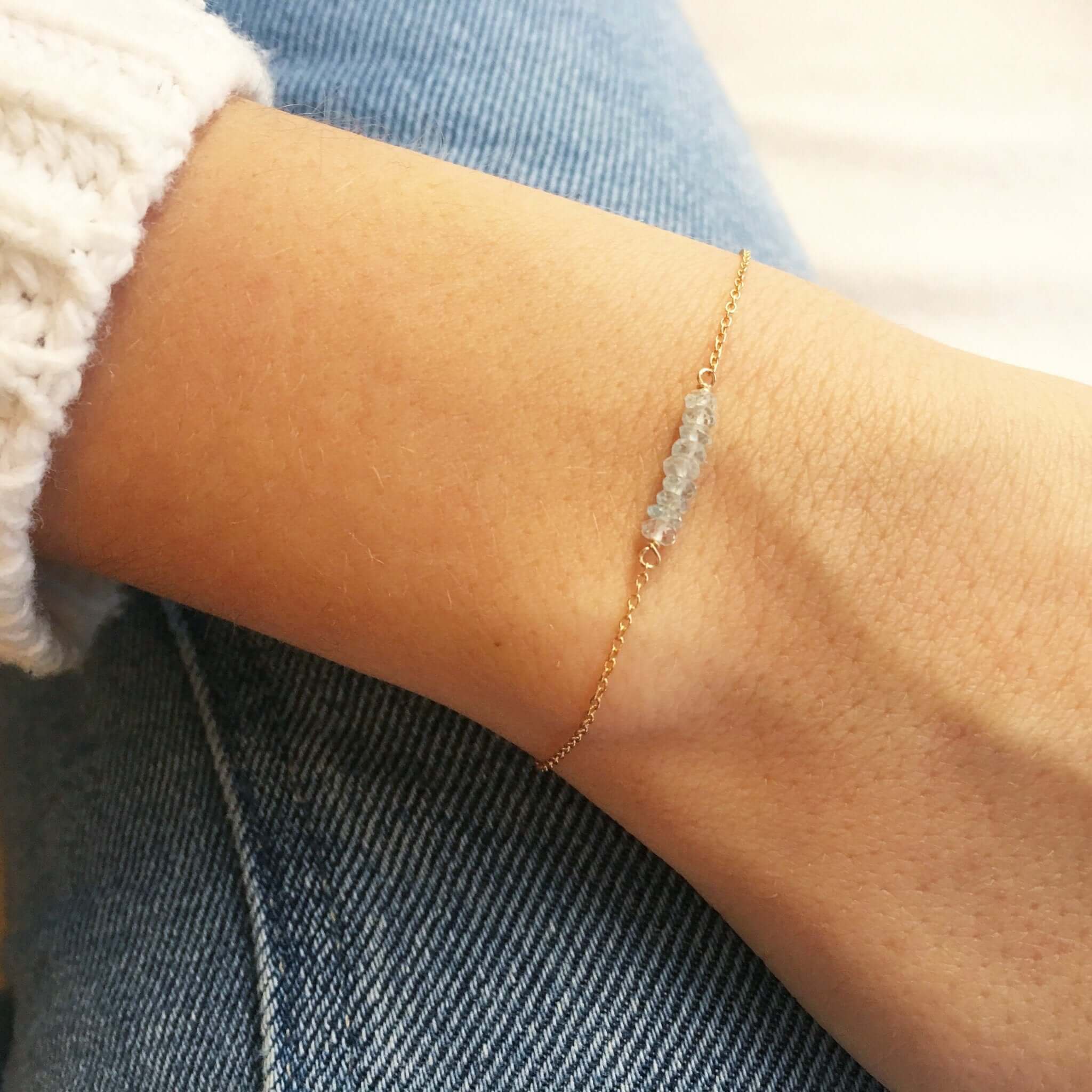 Adorn yourself with our dainty beaded aquamarine birthstone bracelet. Lightweight and simple, the tiny row of delicate beaded aquamarine gemstones makes the perfect everyday bracelet. We love layering in a bracelet stack.