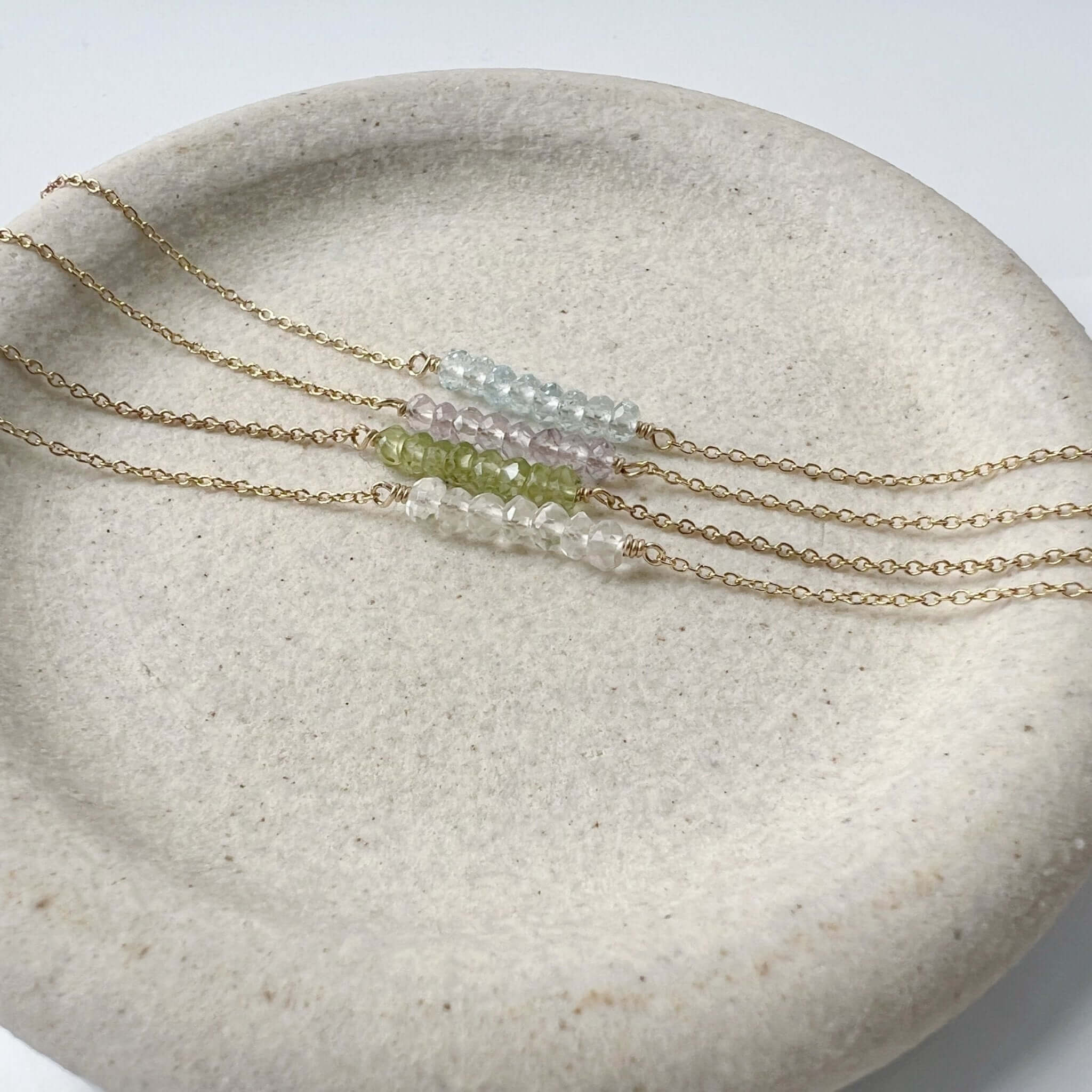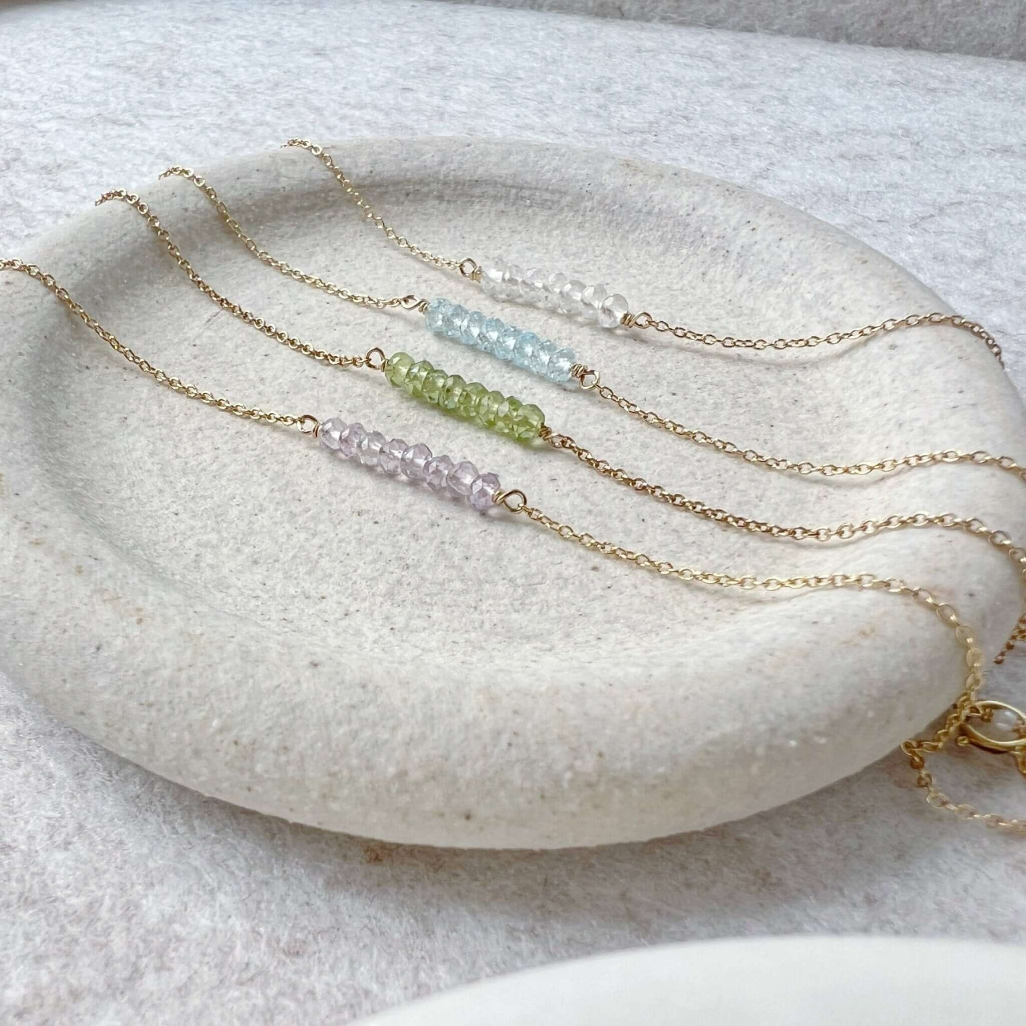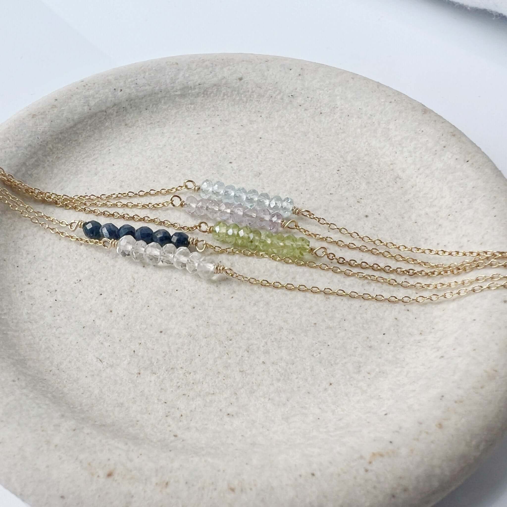 Adorn yourself with our dainty beaded aquamarine birthstone bracelet. Lightweight and simple, the tiny row of delicate beaded aquamarine gemstones makes the perfect everyday bracelet. We love layering in a bracelet stack.