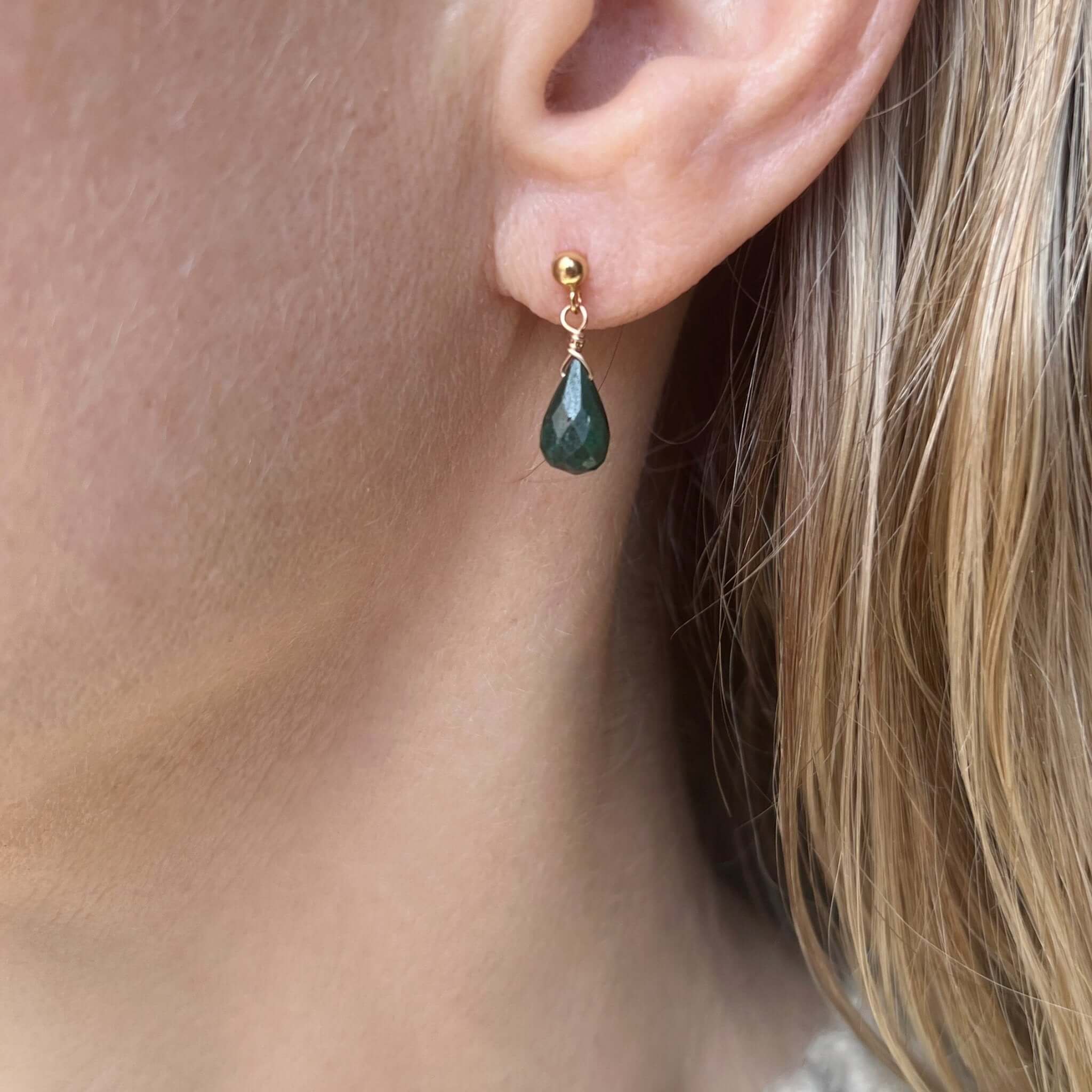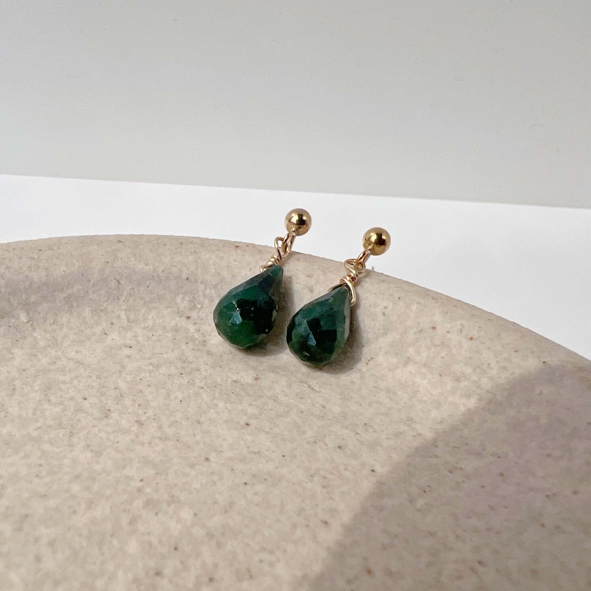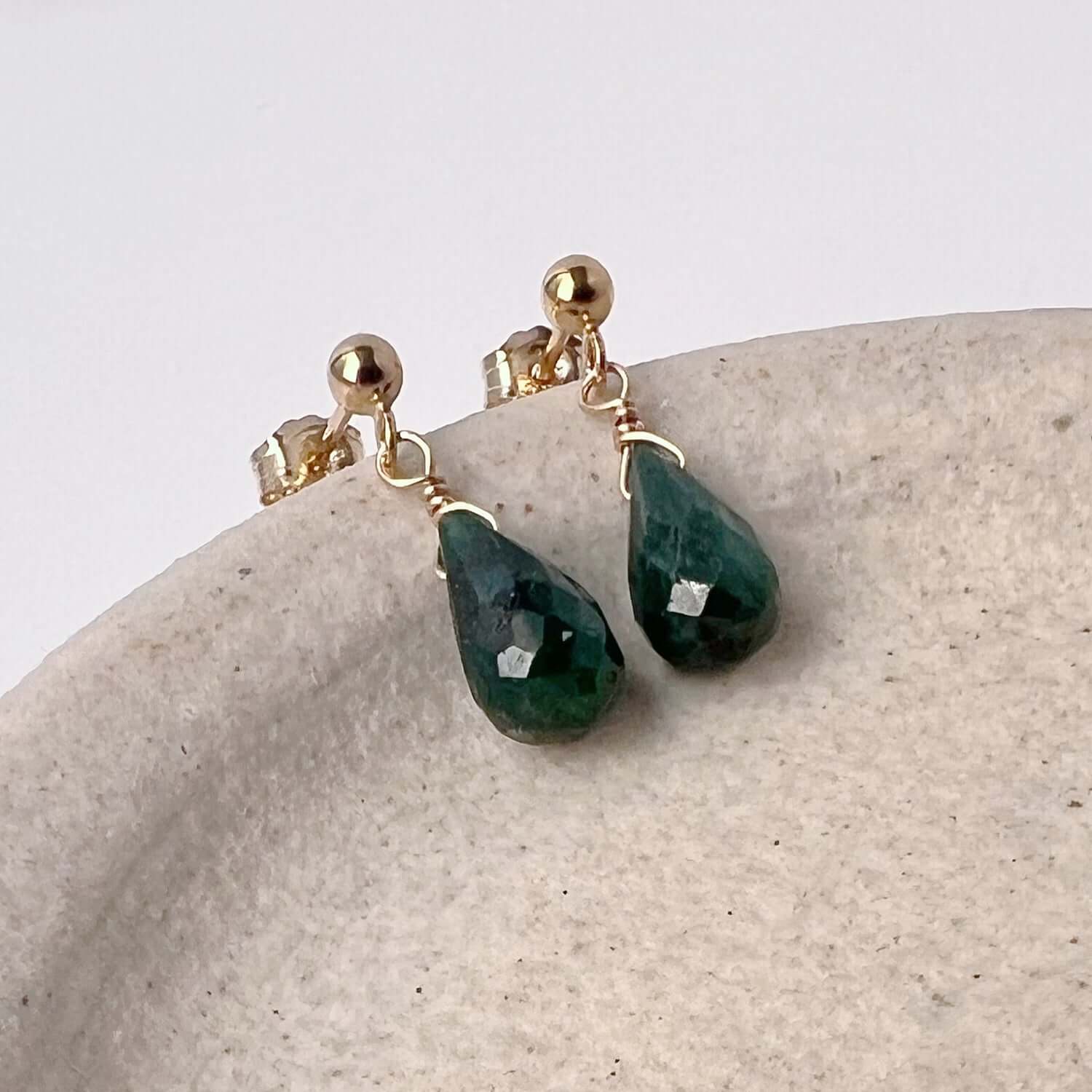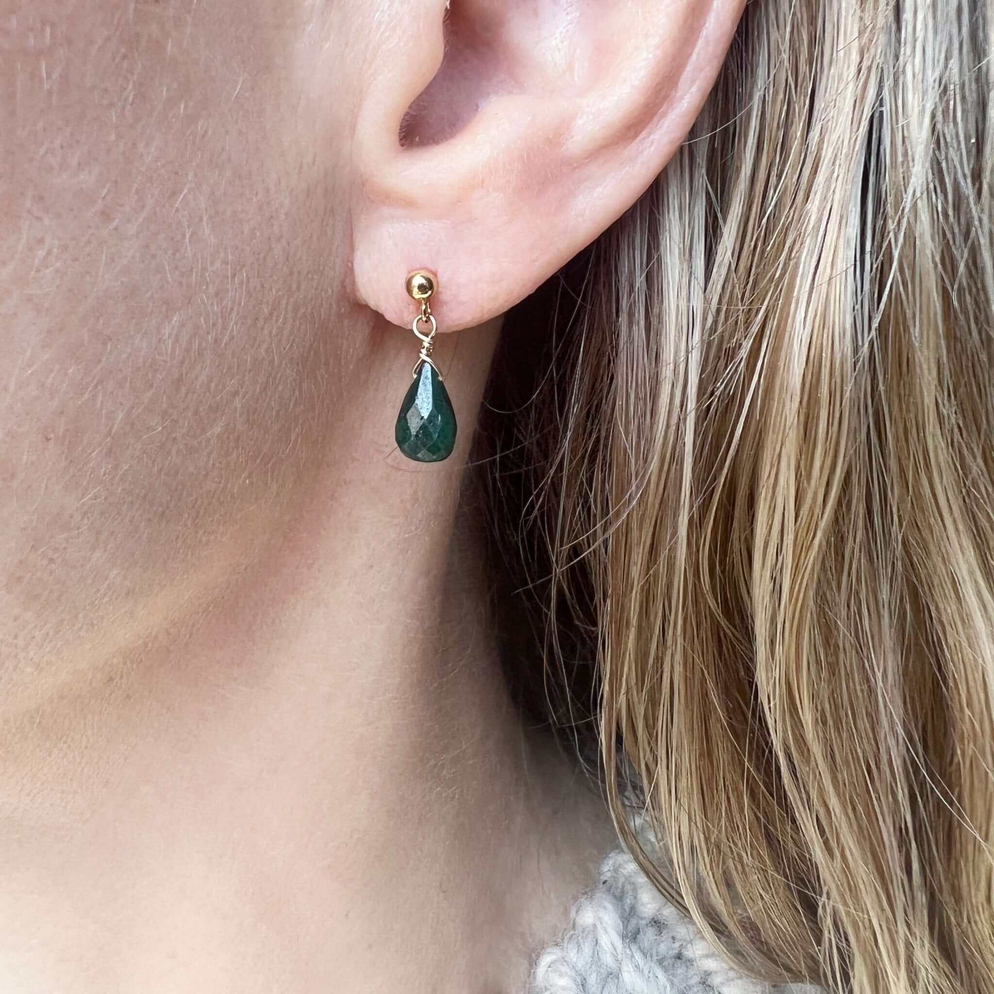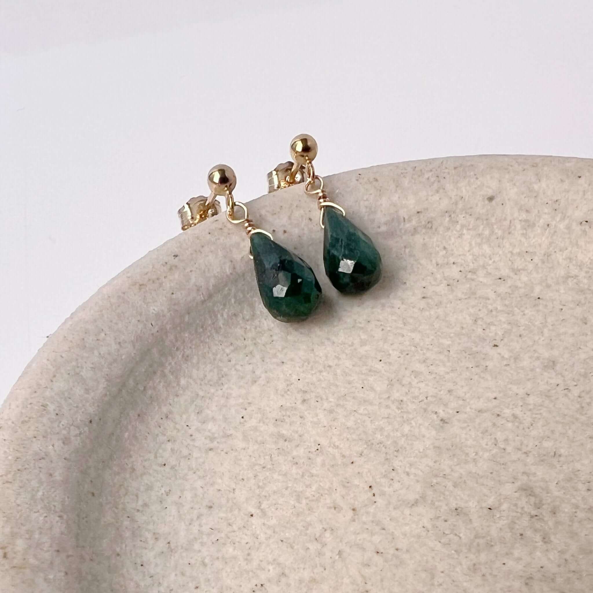 These emerald stud earrings feature genuine emerald gemstones with a delicate drop design that adds subtle movement and color. Rich green tones make them a timeless piece that feels both refined and easy to wear.