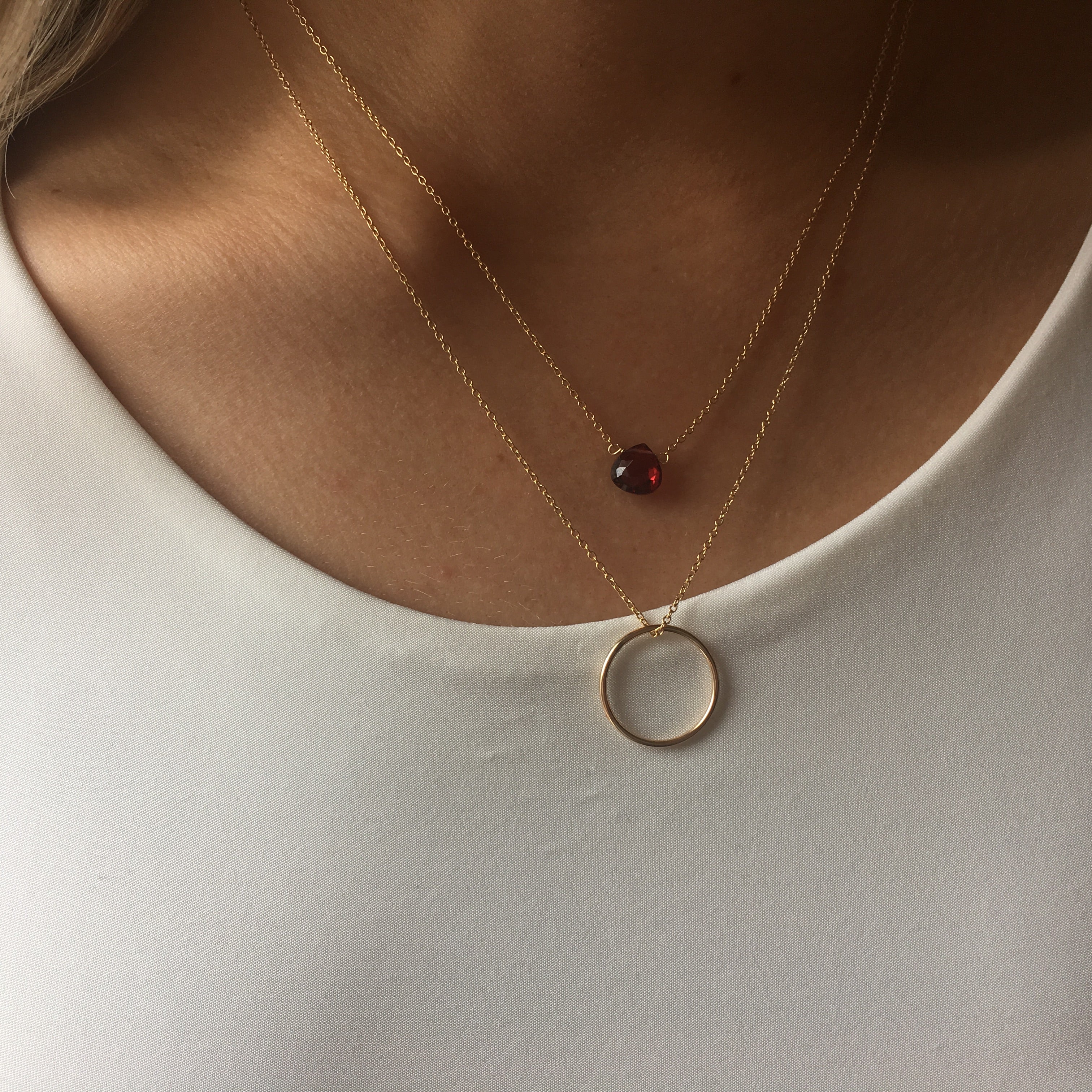 The deep crimson garnet adds a subtle pop of color, while the minimalist circle pendant symbolizes wholeness and connection. Designed as a pre-layered piece, the two necklaces sit beautifully together with no styling guesswork.