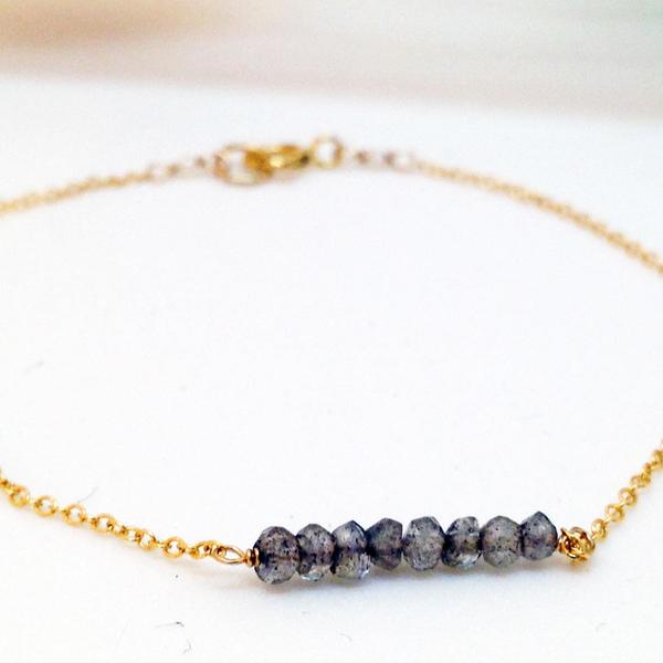 Soft gray labradorite beads form a delicate horizontal bar, creating a bracelet that feels subtle, modern, and effortless. Designed for everyday wear, this minimalist piece adds just the right amount of texture and shimmer to your wrist.
