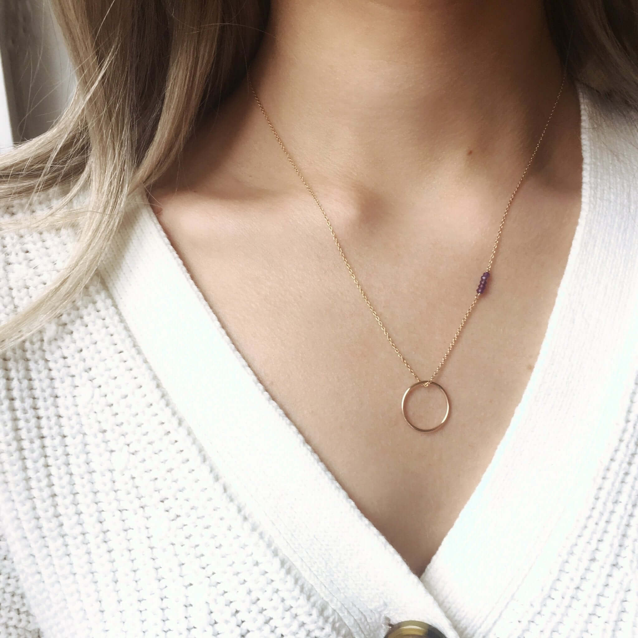 Simple, timeless, and effortlessly elegant — this minimalist circle pendant necklace features a delicate open circle paired with a tiny amethyst gemstone accent for just a hint of color and meaning.