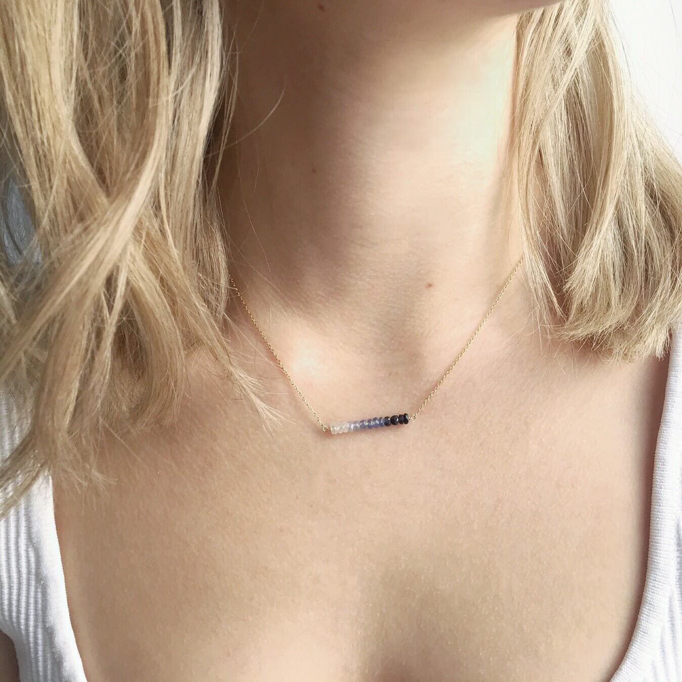 This ombré sapphire necklace features a delicate row of genuine blue sapphires that gradually shift in tone, creating a soft gradient effect with depth and movement. The design balances color and minimalism, offering a refined statement that remains easy to wear.