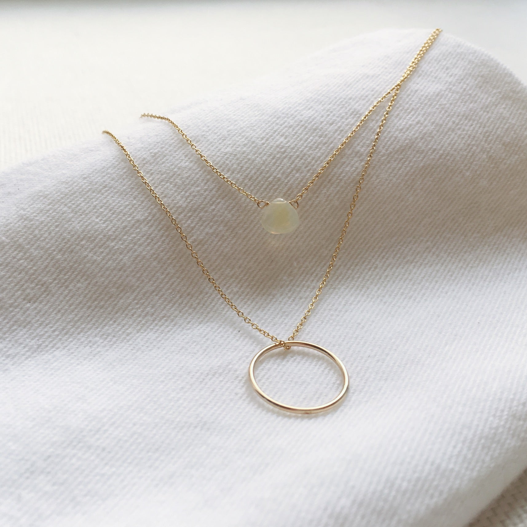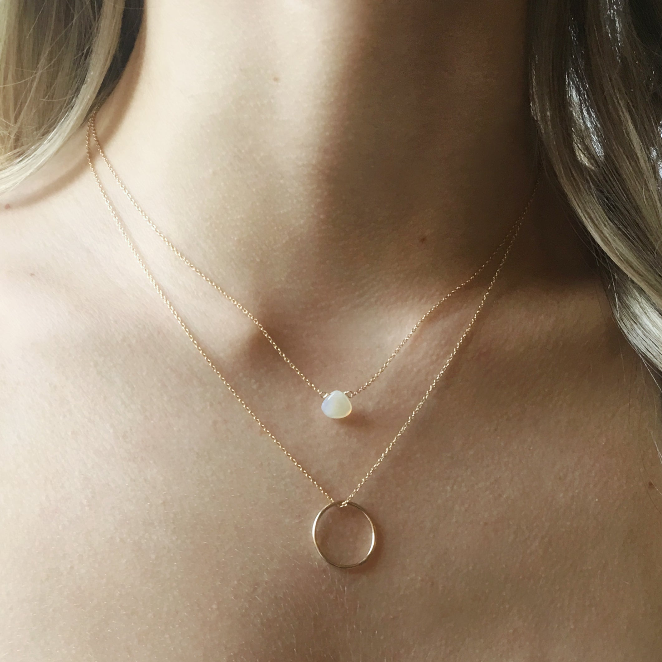 Take the guesswork out of necklace layering with our double-strand opal and circle necklace joined together with a single clasp. The shorter necklace has a beautiful Ethiopian Opal on a dainty cable chain, and the longer necklace has a dainty circle suspended from a cable chain. Opal is the October birthstone.