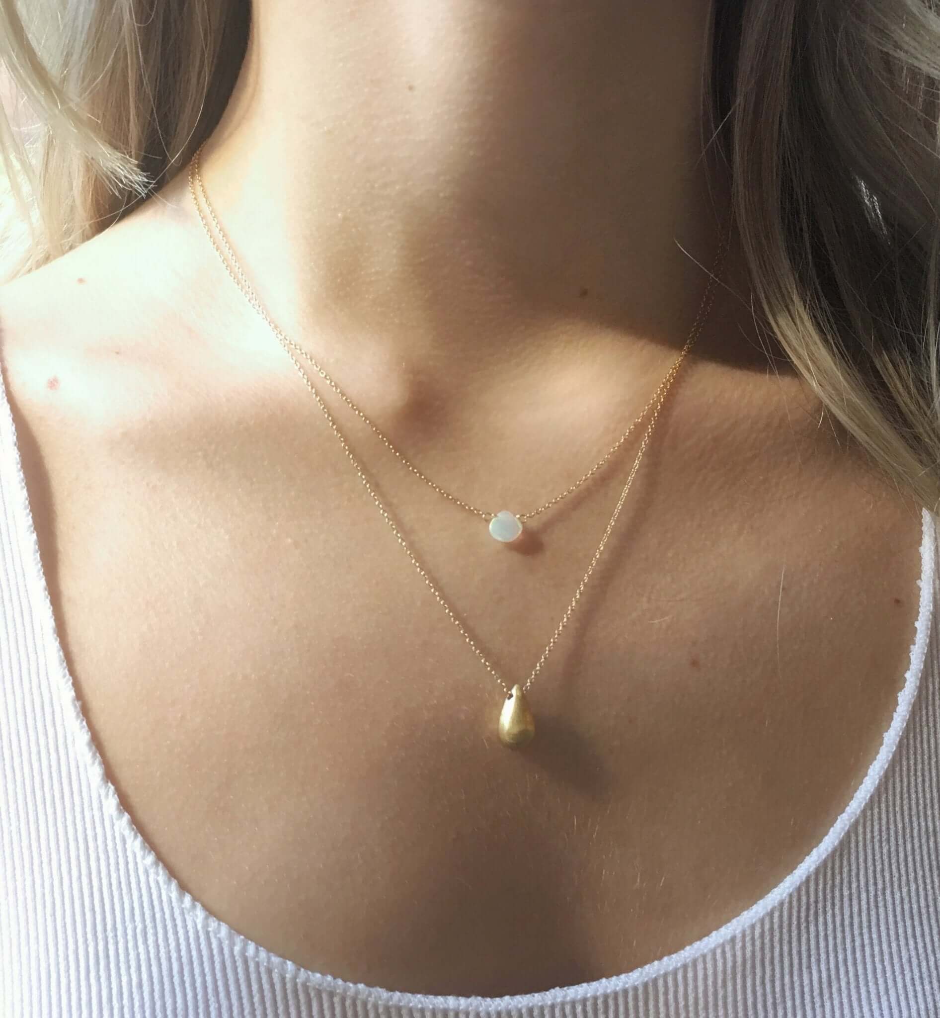 Take the guesswork out of necklace layering with our double-strand opal and teardrop pendant necklace joined together with a single clasp. The shorter necklace has a beautiful Ethiopian Opal on a dainty cable chain, and the longer necklace a gold teardrop suspended from a cable chain. Opal is the October birthstone.