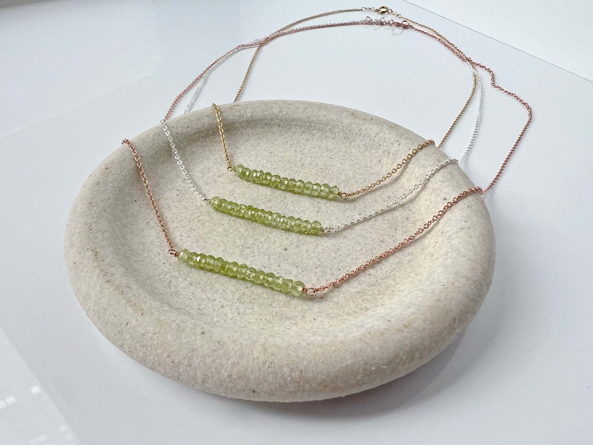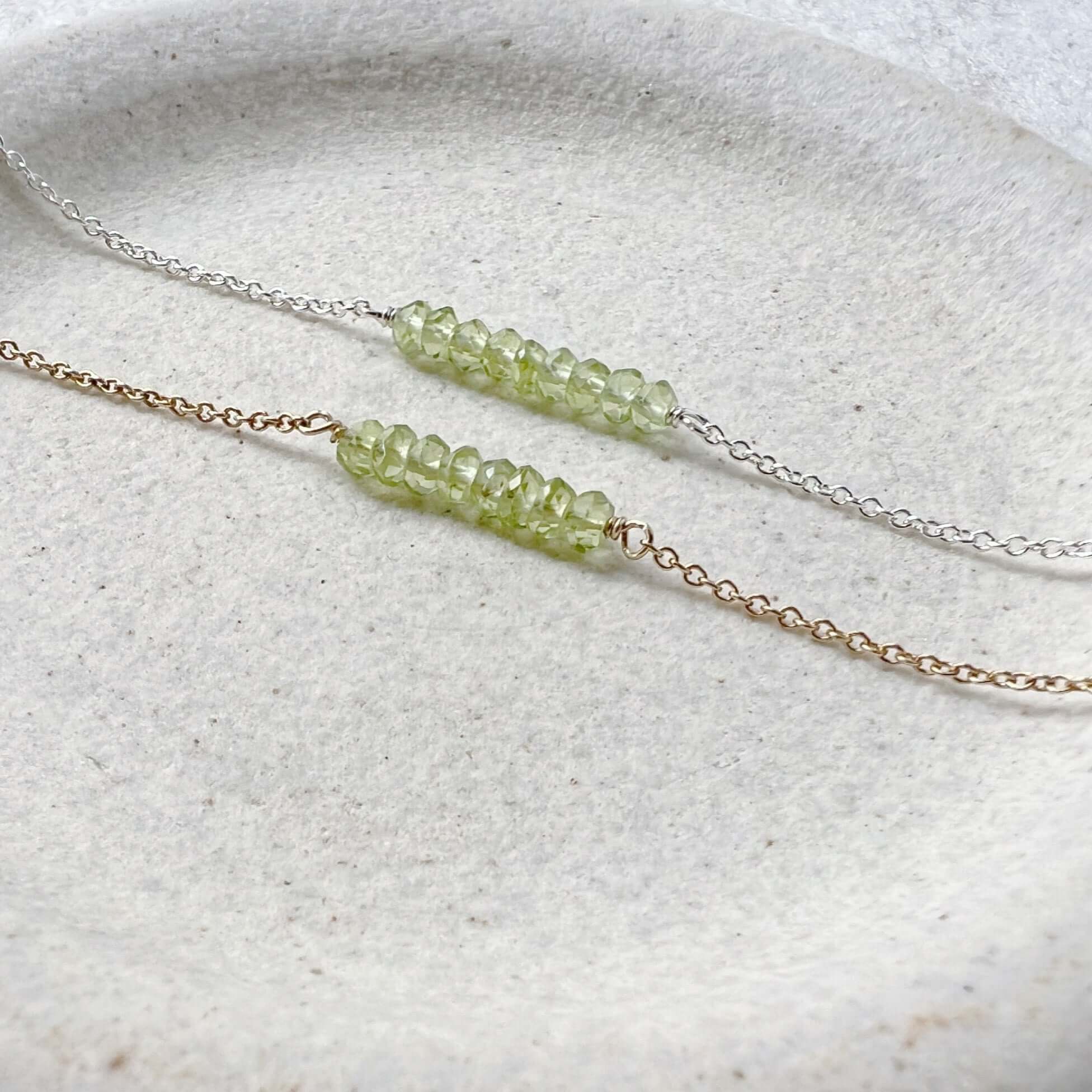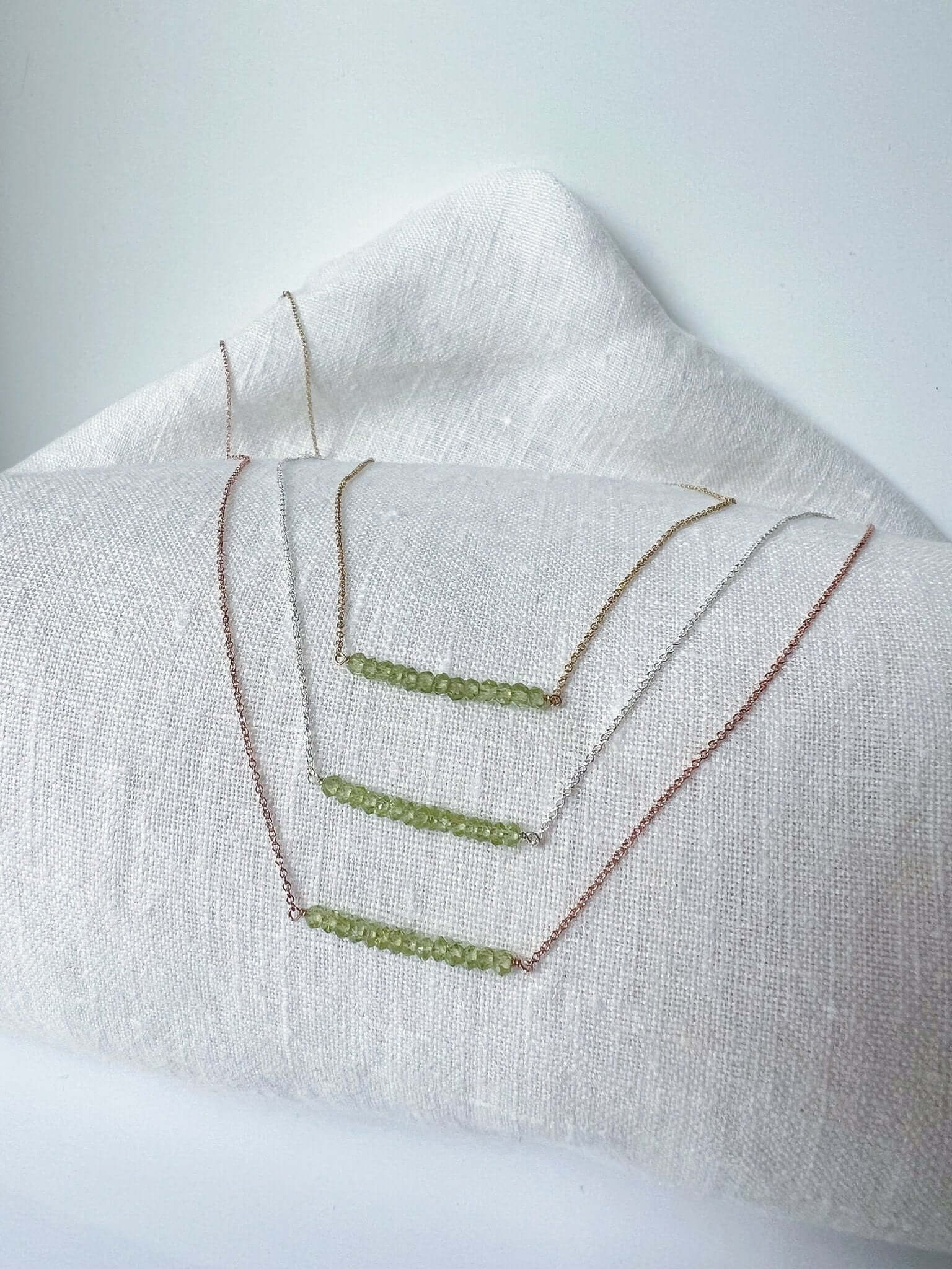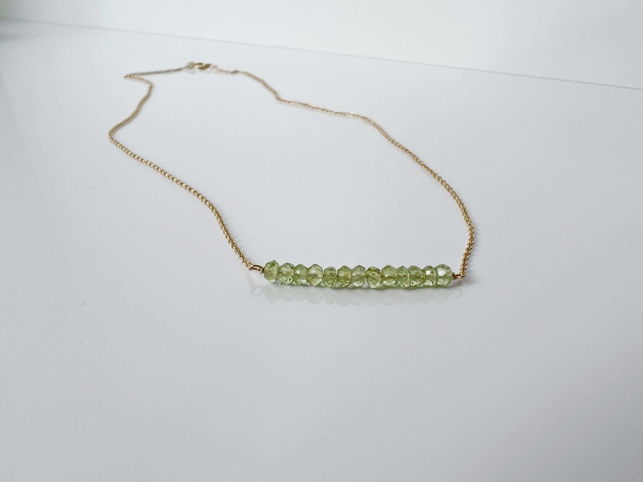 This peridot beaded bar necklace features genuine peridot gemstones arranged along a slim bar for a clean, modern look. The soft green hue adds a subtle pop of color while remaining elegant and easy to wear every day.