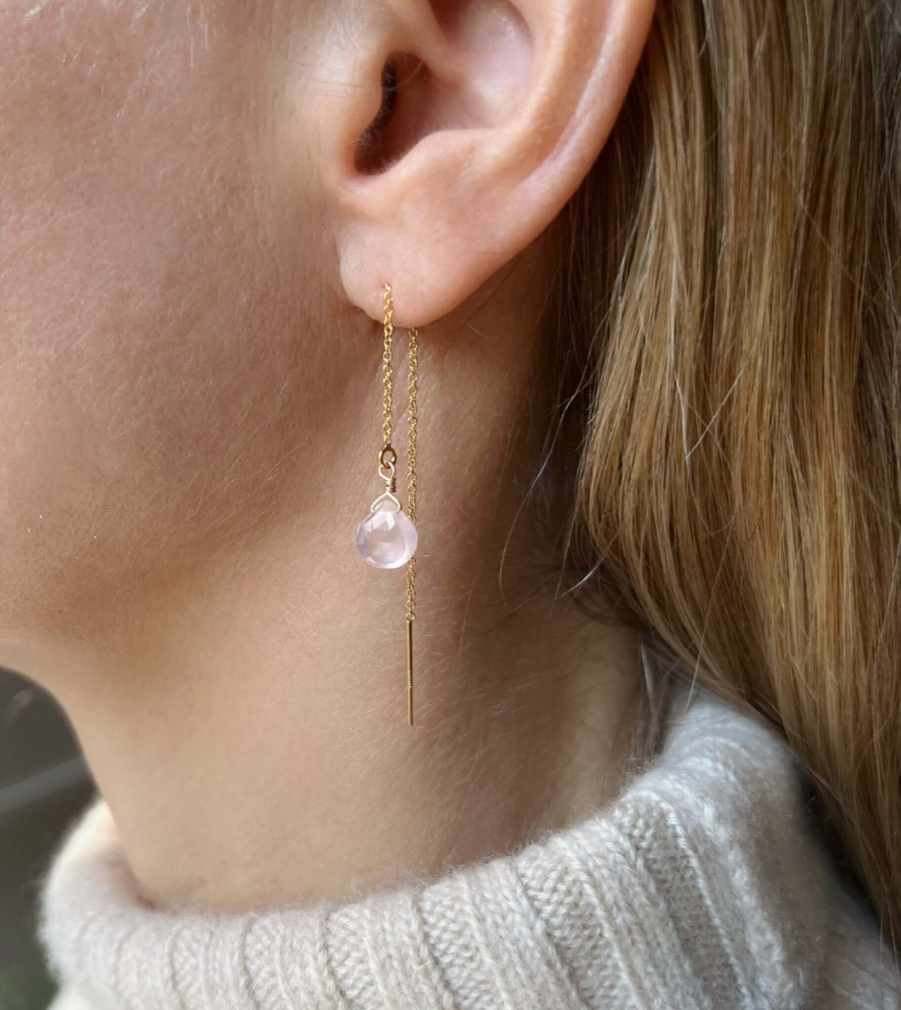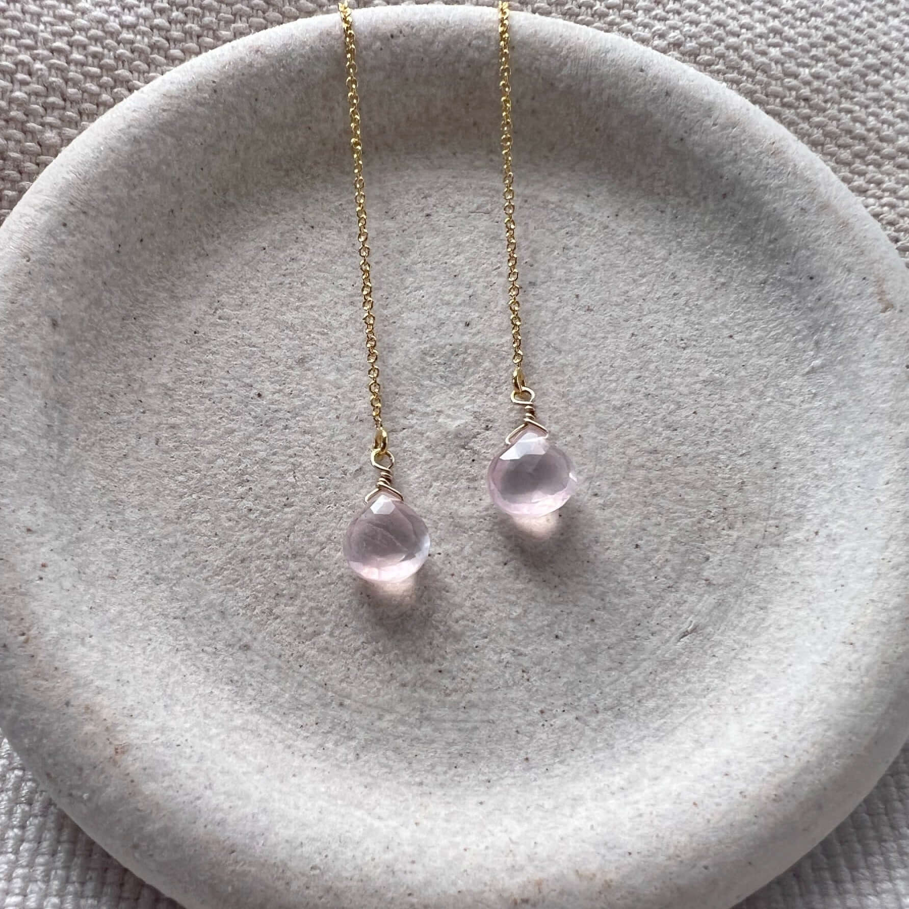 Each earring features a genuine rose quartz gemstone suspended from a fine threader chain that glides gently through the ear for a lightweight, barely-there feel. Known as the stone of love, rose quartz adds a subtle blush tone that pairs beautifully with both casual and elevated looks.