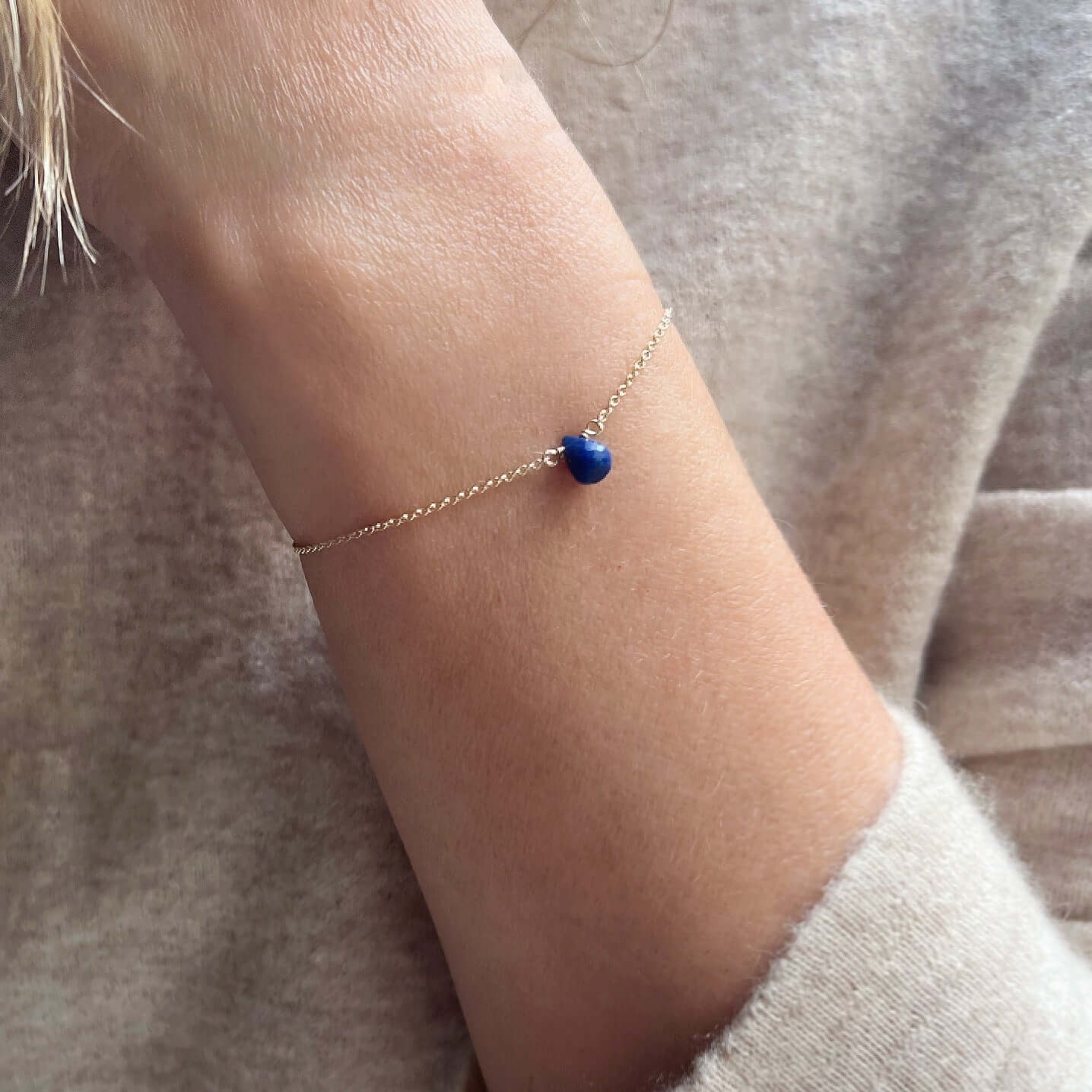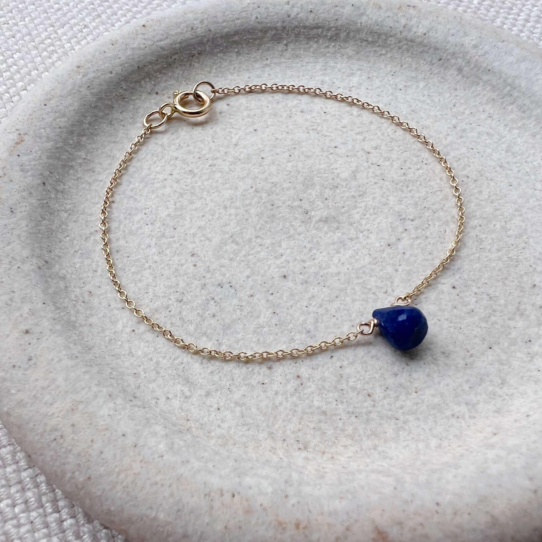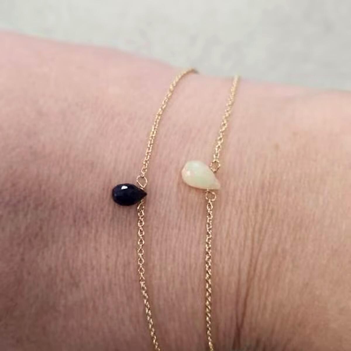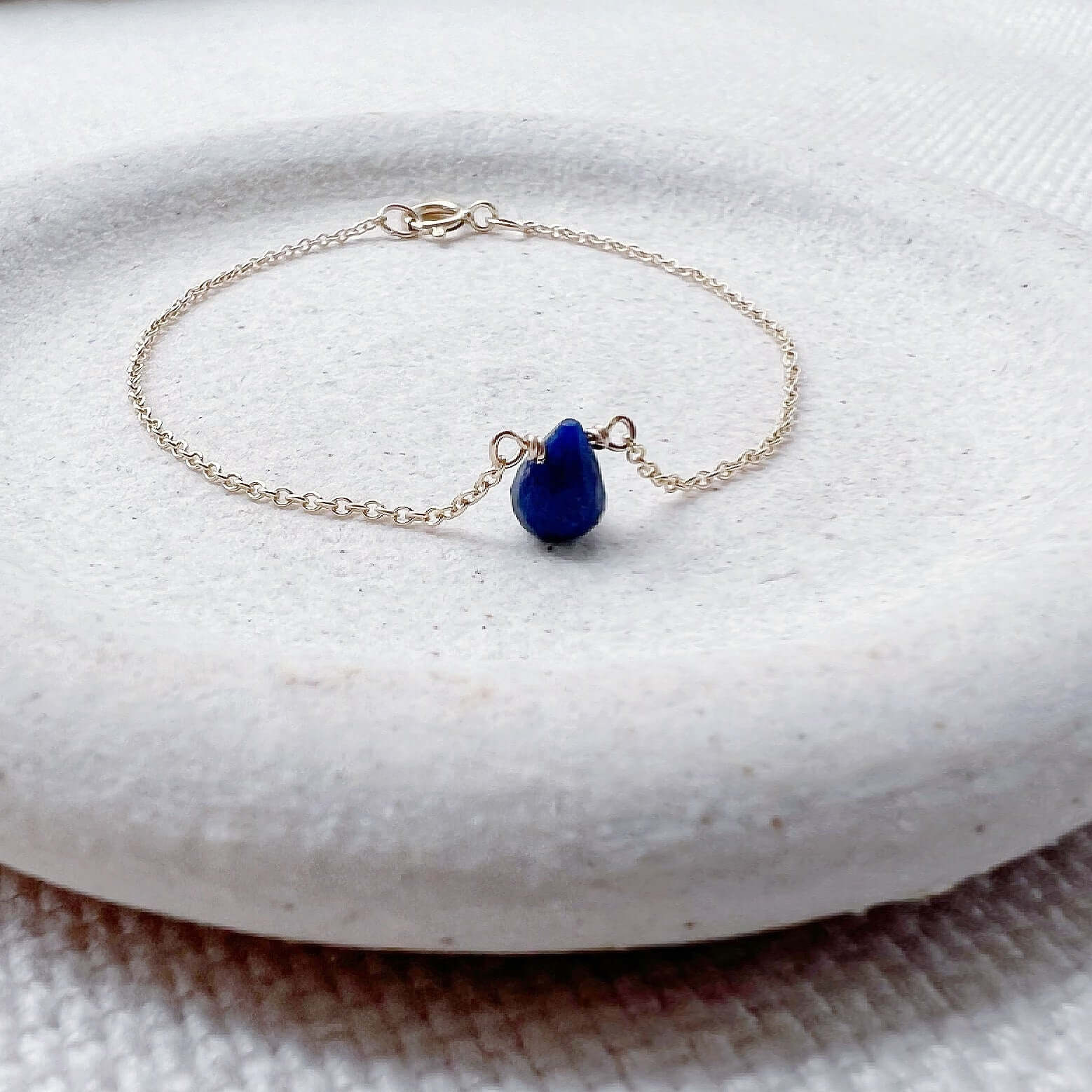This sapphire teardrop bracelet features a genuine blue sapphire in a simple teardrop shape, suspended from a delicate chain for an elegant, minimalist look. The rich blue gemstone adds just the right amount of color while remaining subtle enough for everyday wear.
