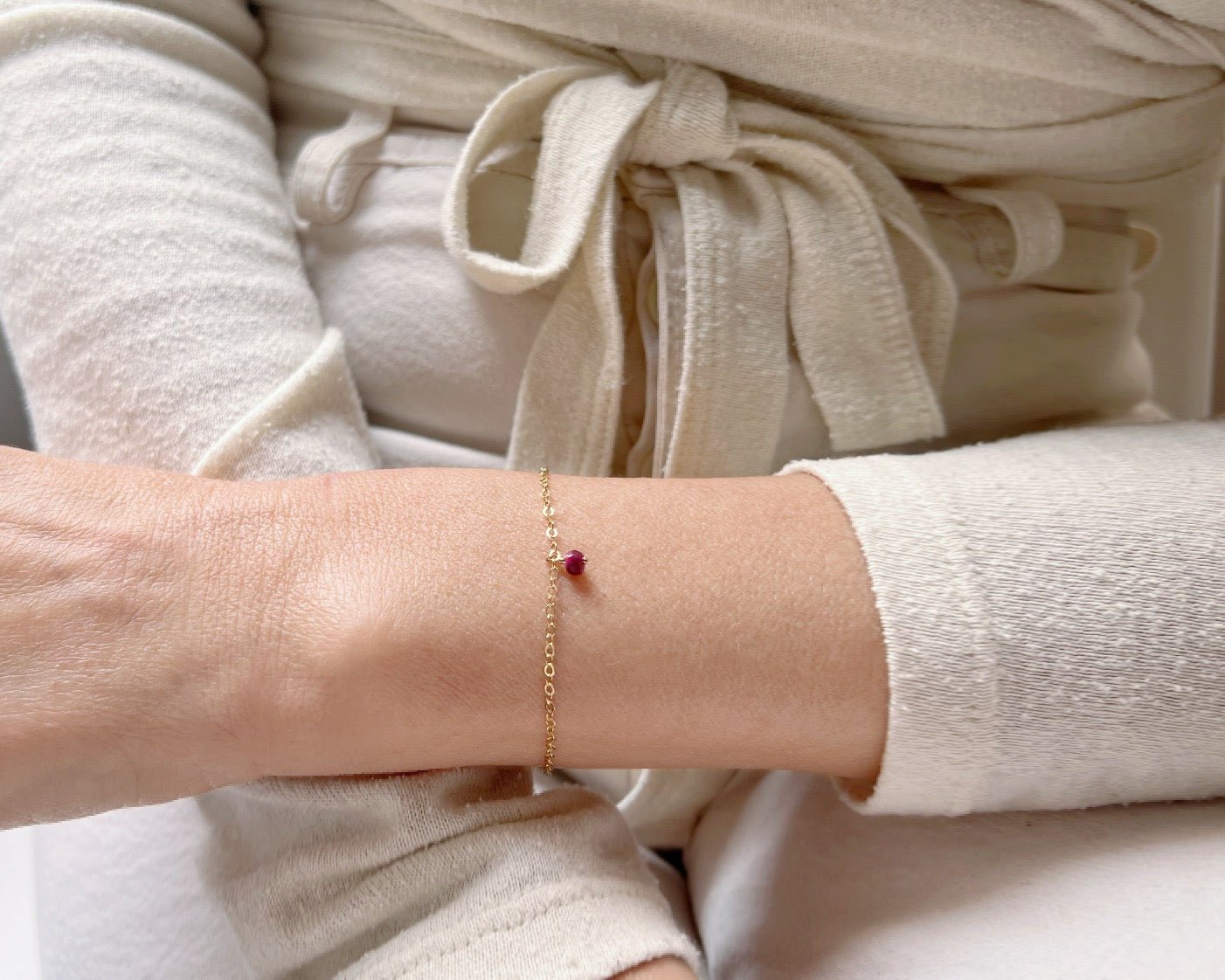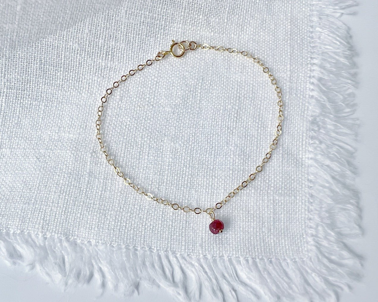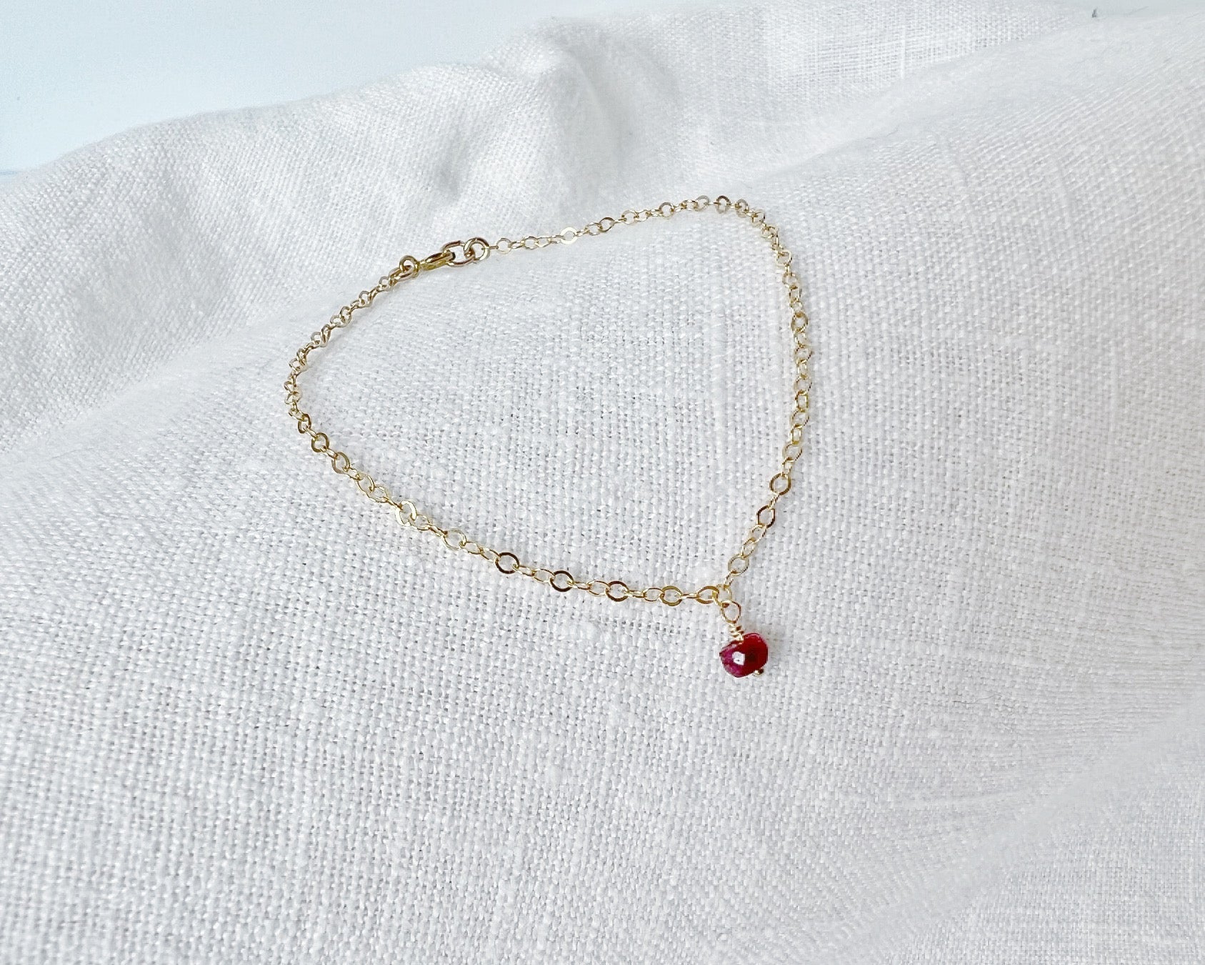 This tiny ruby dangle bracelet features a genuine ruby birthstone suspended from a delicate chain for a subtle pop of deep red color. Designed to feel lightweight and effortless, it’s an easy everyday bracelet that adds a meaningful touch to any look.